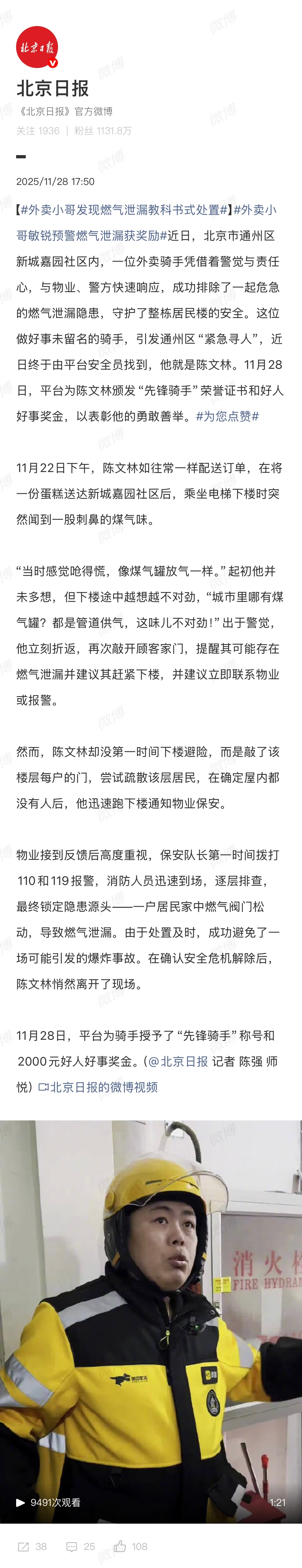 这事挺有意思的,本来外卖小哥是做好事不留名,一起帮忙解决了燃气泄漏的隐患问题,守护了整栋居民楼的安全。后面被平台安全员找到了这位做好事未留名的骑手,并为当事人颁发了“先锋骑手”荣誉证书和好人好事奖金,挺实在的。外卖小哥发现燃气泄漏教科书式处置外卖小哥敏锐预警燃气泄漏获奖励