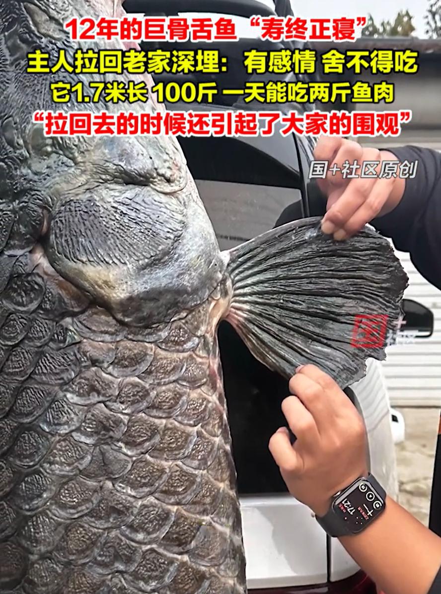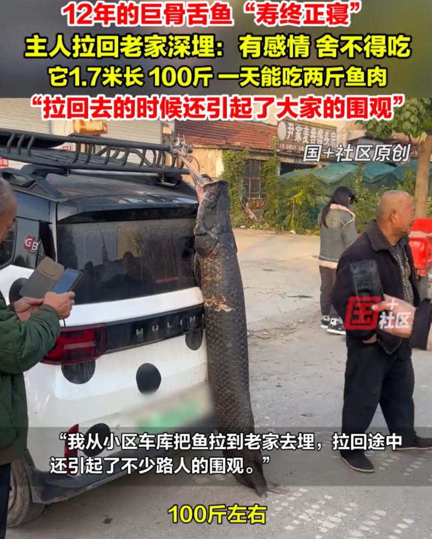 “也算是长寿鱼了!”山东滨州,一男子养在家里12年的巨骨舌鱼“寿终正寝”了,不过他并没有选择吃掉,也没有直接扔掉,而是把这条一米七长的鱼挂在车上,拉回老家深埋,没想到,鱼虽然死了,但这一路上却相当惹人关注 成先生介绍,这条鱼有一米七长,一百斤重,从小到大都是人工养的。如果在野外,一般这种鱼能活10-15年,家养相对短些,能养到十二年算不错了。养这么久,已经不是一条鱼的事了,是一种陪伴。他隔两三天喂一回,每次要两斤肉,看似麻烦,其实就是习惯了 鱼去了,他心里堵得慌。埋回老家,是想留个念想,也算给这条鱼画个句号。他以为就是悄悄运回去埋一下,没料到一路上不时有人凑上来问一句,这么大的鱼怎么回事。别人觉得新鲜,他觉得是最后的体面 有网友说:一条鱼而已,至于这样吗 这样的话,显然说的有些轻巧了,能把一条鱼养十二年,不是随便往鱼缸里倒点水、撒几粒饲料就完事的,是连续十二年不掉链子的照料。时间一长,它就不再是鱼缸里的摆设,而是生活的一部分。别人看到的只是一条鱼,他看到的是陪伴,是习惯,是每天跟自己同框的那点烟火气 说一句一条鱼而已,是站在局外人的视角,看个热闹。但对养鱼的人来说,这是他亲手养出来的生命,是十二年堆出来的情感。不能因为对象是鱼,就把这份心意直接打折扣。真正的感情不看物种,看投入 至少我觉得,一个人愿意郑重地送别自己养过的东西,说明他对生活有分寸感。能把结束处理得体面的人,往往也是能把日子过得不马虎的人 巨骨舌鱼寿终正寝 主人拉回老家深埋