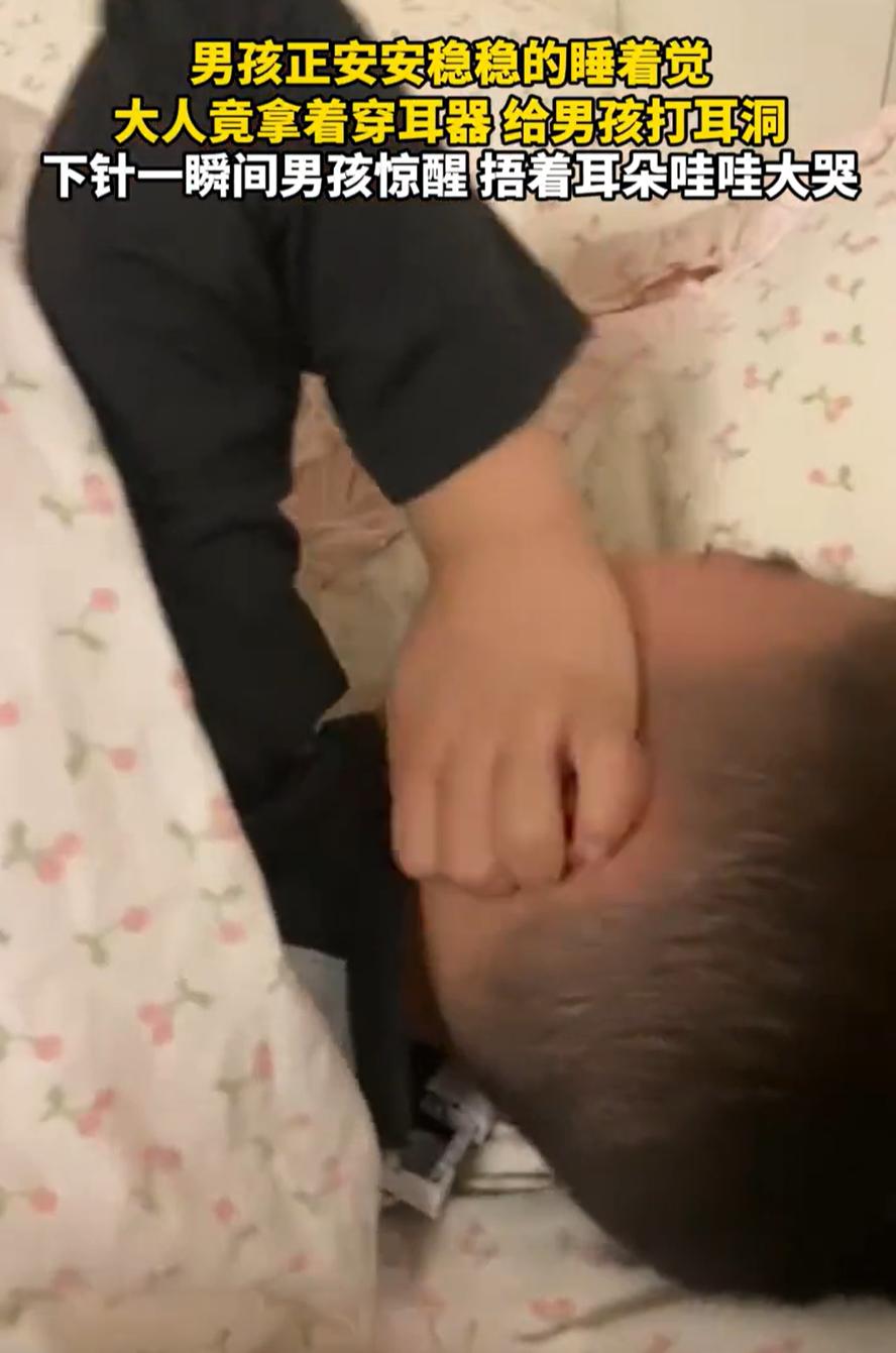 “这是要干吗?”湖南,小男孩正在床上安安静静的睡觉,没想到,家里的大人却趁这个时机,手拿穿儿器给孩子打了一个耳洞,突然的刺痛,也让孩子哇哇大哭,可大人却在旁边拍视频发到了网上,结果可想而知,被清一色的网友质疑 视频中,孩子侧躺在床上,这时大人一边拿手机拍着视频,一边拿着穿耳器,对准宝宝耳垂的位置一下扎进去,原本安安静静睡觉的孩子也是瞬间惊吓,捂着耳朵娃娃痛哭,小脚也是在床上乱踹,可想而知有多疼 对此,网友最多的评论就是不理解 有网友猜测,这是不是什么少数民族需要,不然完全不理解家长为什么要这么做 还有网友说:男的打耳洞干嘛?就算是女孩打耳洞,也不是这么小,还是趁她睡觉的时候打啊 其实这真不怪大家质疑,很多家长会觉得孩子小,好弄、好操作。可越小越需要被当成一个人对待。他可能不懂耳洞是什么,也无法表达拒绝,可他的痛和害怕是真实的。哪怕只是提前说一声,哪怕是在清醒状态下安抚一下,孩子心里都能踏实很多 孩子不是父母的“作品”,更不该在无意识的情况下,被迫接受身体上的改变。大多数人小时候都有过突然被推进去吃药、突然被剪头发、突然被打针的经历,那种不知道发生了什么的害怕,会在心里留下印记。成年人现在回头看,不会再疼了,可当年的那种无助,其实都记得 爱孩子,不是给他我们认为“好”的东西,而是尊重他是一个独立的个体,哪怕他还不会说话,哪怕他还在熟睡