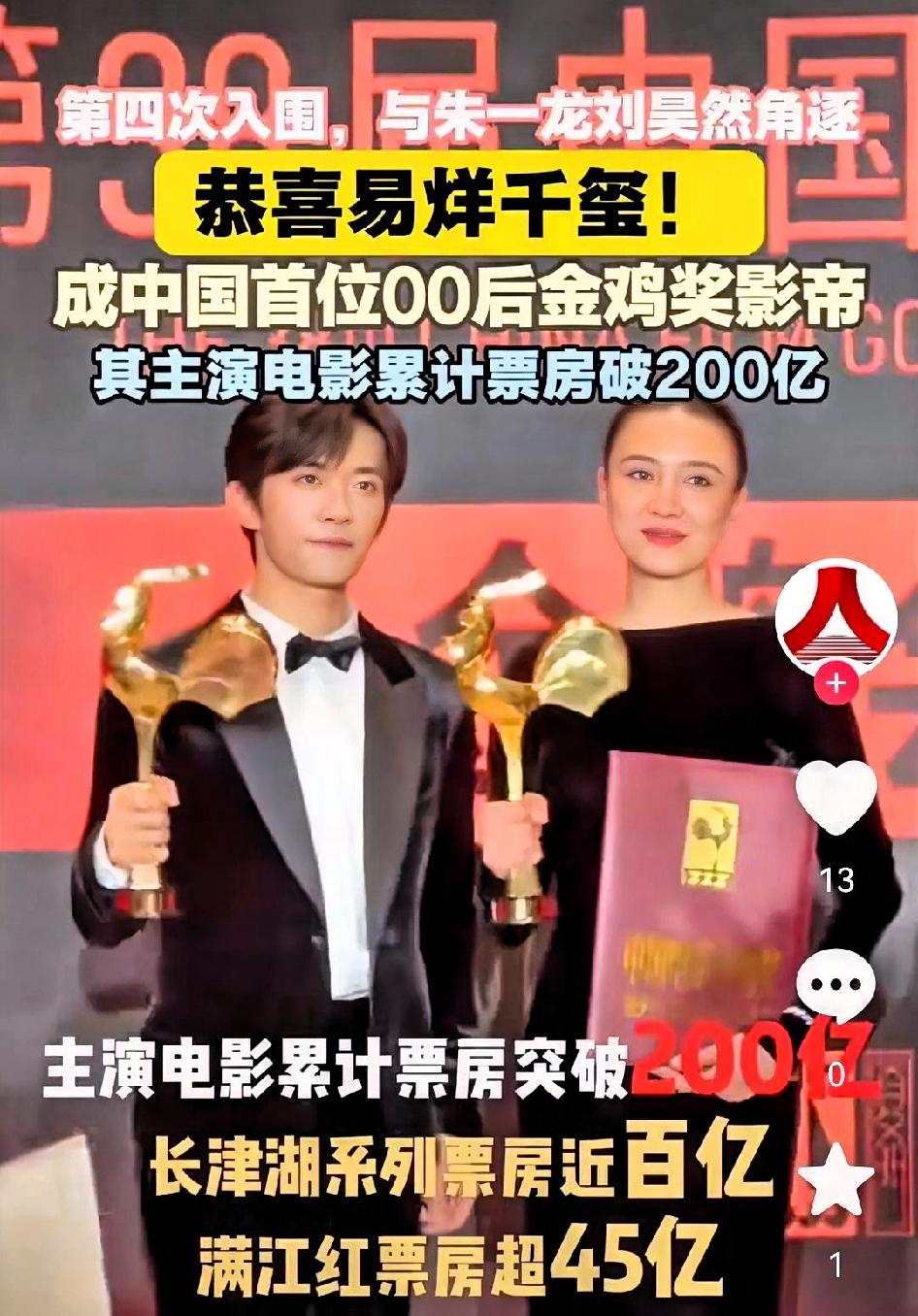2025年11月,他凭借《小小的我》中脑瘫患者刘春和一角,斩获第38届金鸡奖最佳男主角,以24岁11个月成为金鸡奖史上最年轻影帝,还成为华语五大电影奖项中首位00后最佳男主角得主。为塑造这一角色,他提前住进康复中心观察患者日常,练“对抗性发力”练到收工需筋膜放松才能入睡,片中食物洒身却淡然微笑的即兴戏,还被北电教授评为年度最佳表演瞬间。 而且这并非偶然,此前他已凭《少年的你》《送你一朵小红花》《奇迹·笨小孩》三次提名金鸡奖。他主演影片累计票房早早逼近200亿,新作《狂野时代》还入围戛纳主竞赛单元,张艺谋、陈凯歌等业内大咖也纷纷盛赞他的演技与敬业态度,无论从专业奖项、作品口碑还是行业认可度来看,他的影帝头衔都实至名归。