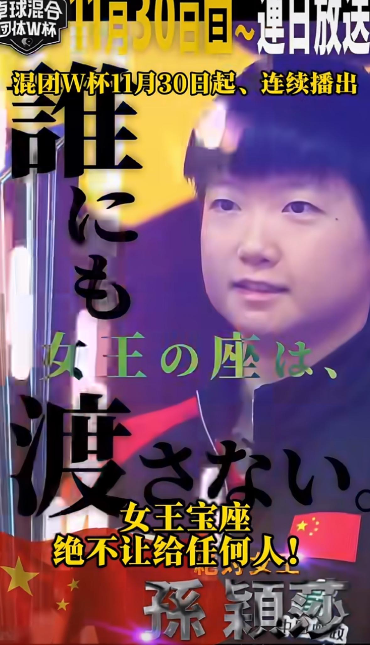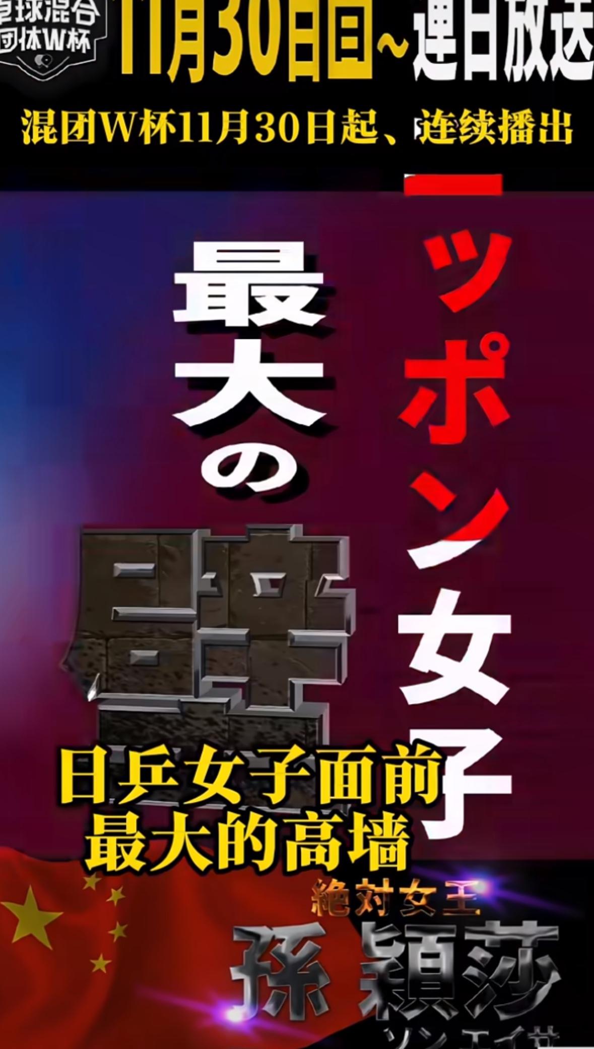 成都混团世界杯—日媒制作孙颖莎宣传片“日乒女子面前最大的高墙,女王宝座绝不让给任何人” 成都混团倒计时一天, 日媒制作宣传片, 盛赞孙颖莎是日乒女队面前 最大的高墙, 孙颖莎以绝对实力征服乒坛…… 对外战,还得是孙颖莎和曼昱, 只有对手才清楚孙颖莎有多强, 别的不说, 日媒制作的宣传片质量很不错👍, 把孙颖莎拍得非常霸气, 孙颖莎不同凡响啊……