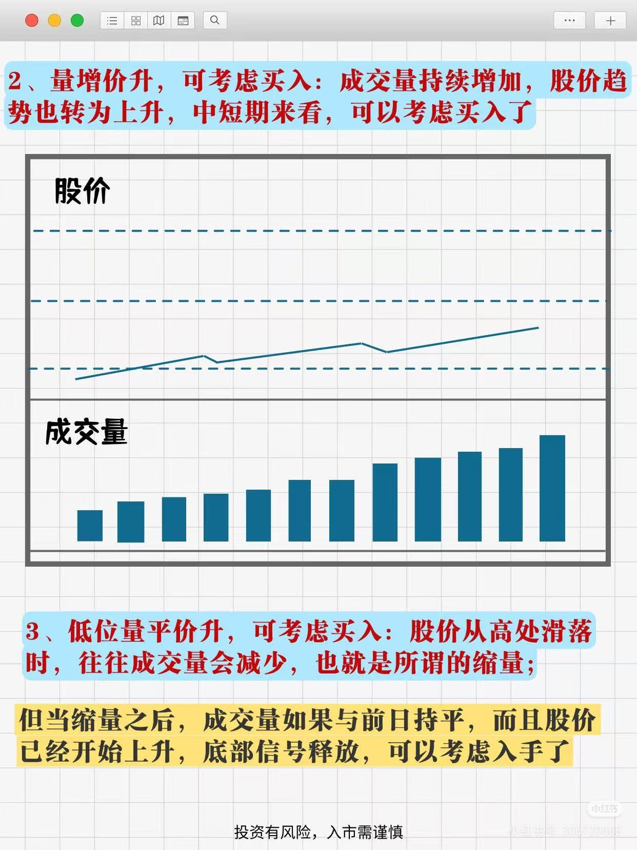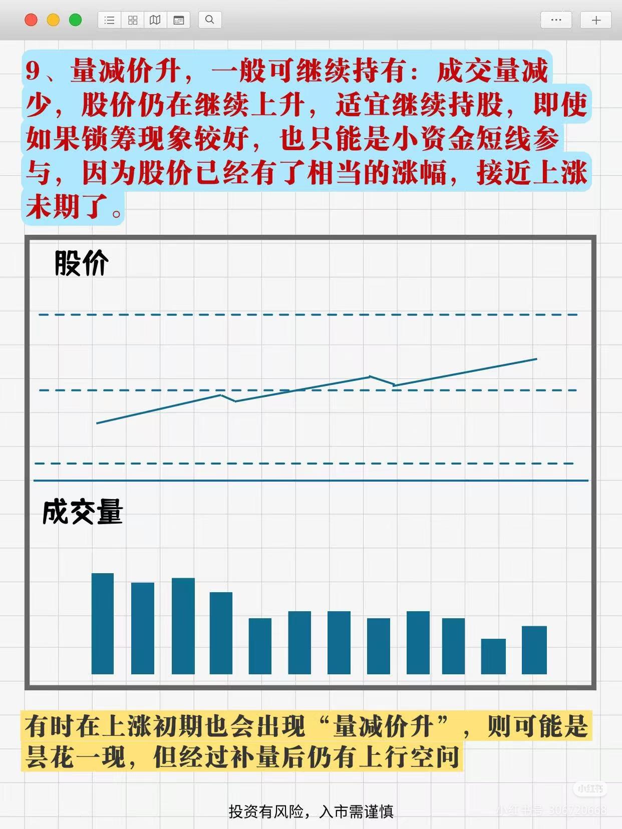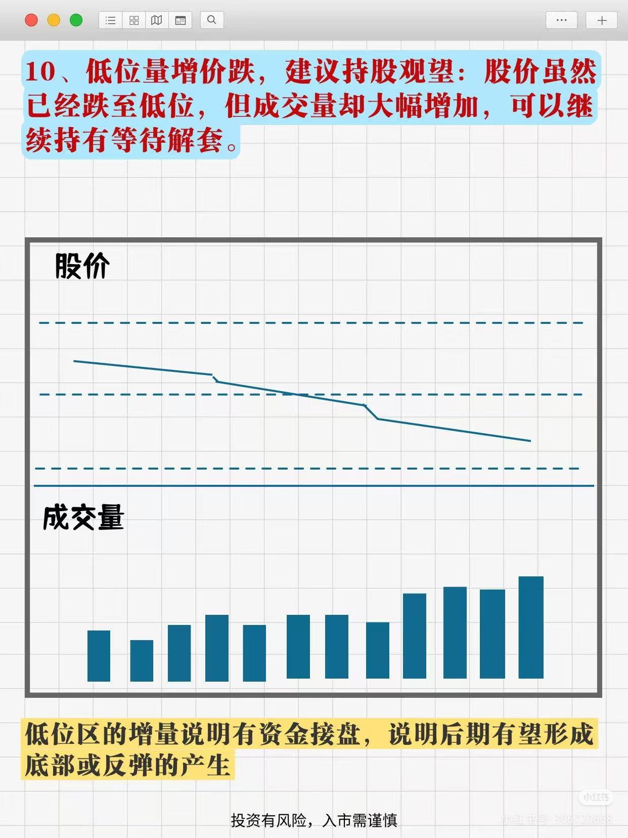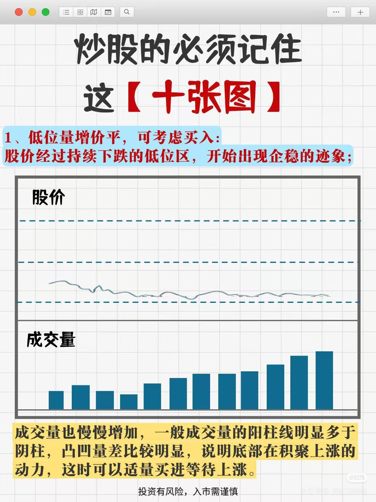 炒股知识分享,总结了量价关系的10种典型情况及操作建议,核心如下: 买入信号(3种) 1. 低位量增价平:低位企稳,成交量渐增(阳柱多),可适量买入; 2. 量增价升:成交量持续增加+股价上扬,中短期可买入; 3. 低位量平价升:缩量后成交量持平+股价上升,底部信号,可入手。 警惕/警戒信号(3种) 4. 高位量平价升:买方力度未增,虽能拉阳线但需警惕; 5. 量减价平:成交量显著减少,建议离场(小盘庄股可能是庄家出货); 6. 量减价跌:成交量减少+股价下降,无量阴跌难测底,建议卖出。 卖出信号(3种) 7. 量平价跌:成交量停减+股价急滑,继续卖出,勿买入; 8. 高位量增价跌:高位增量但价跌(庄股出货/大盘抛压重),果断清仓; 9. 量减价升:成交量减少+股价上升,可继续持有但仅限小资金短线(接近上涨末期)。 持股观望信号(1种) 10. 低位量增价跌:低位区成交量大增(有资金接盘),持股等解套/反弹。 所有内容均附“投资有风险,入市需谨慎”提示,强调技术面判断需结合风险意识。