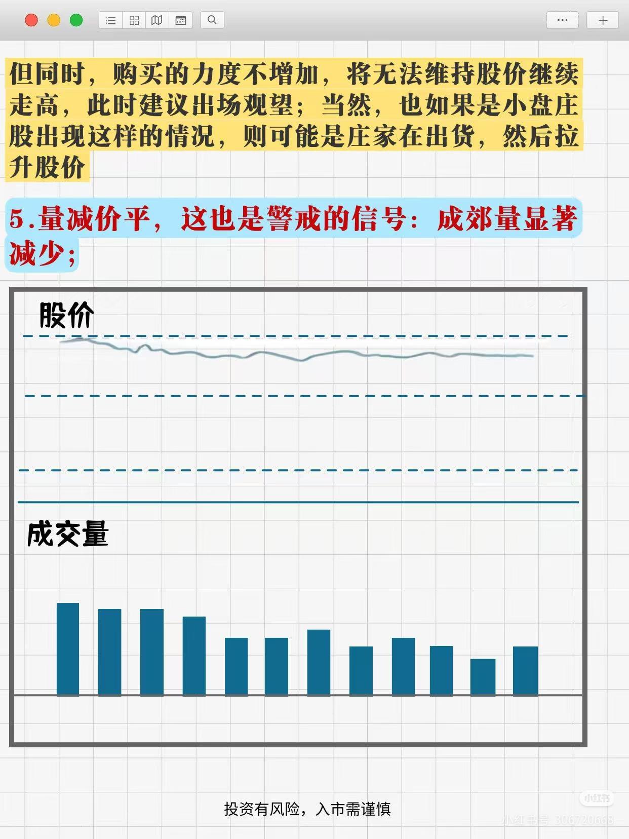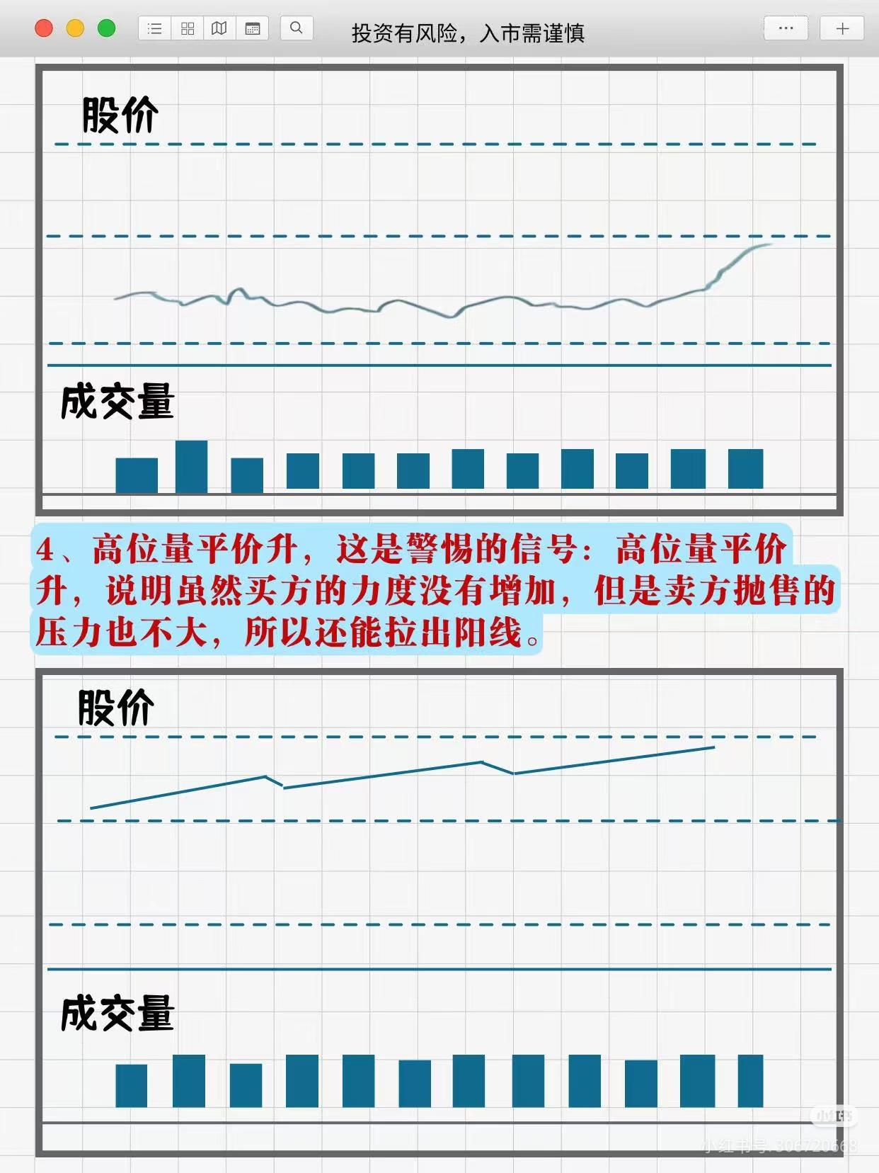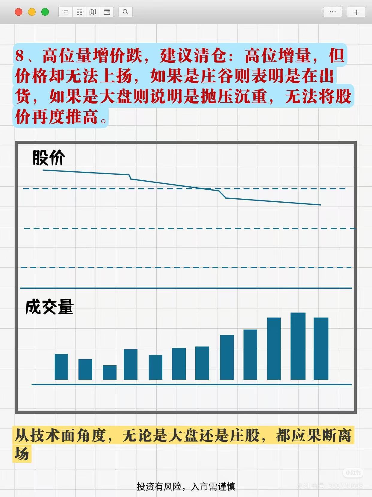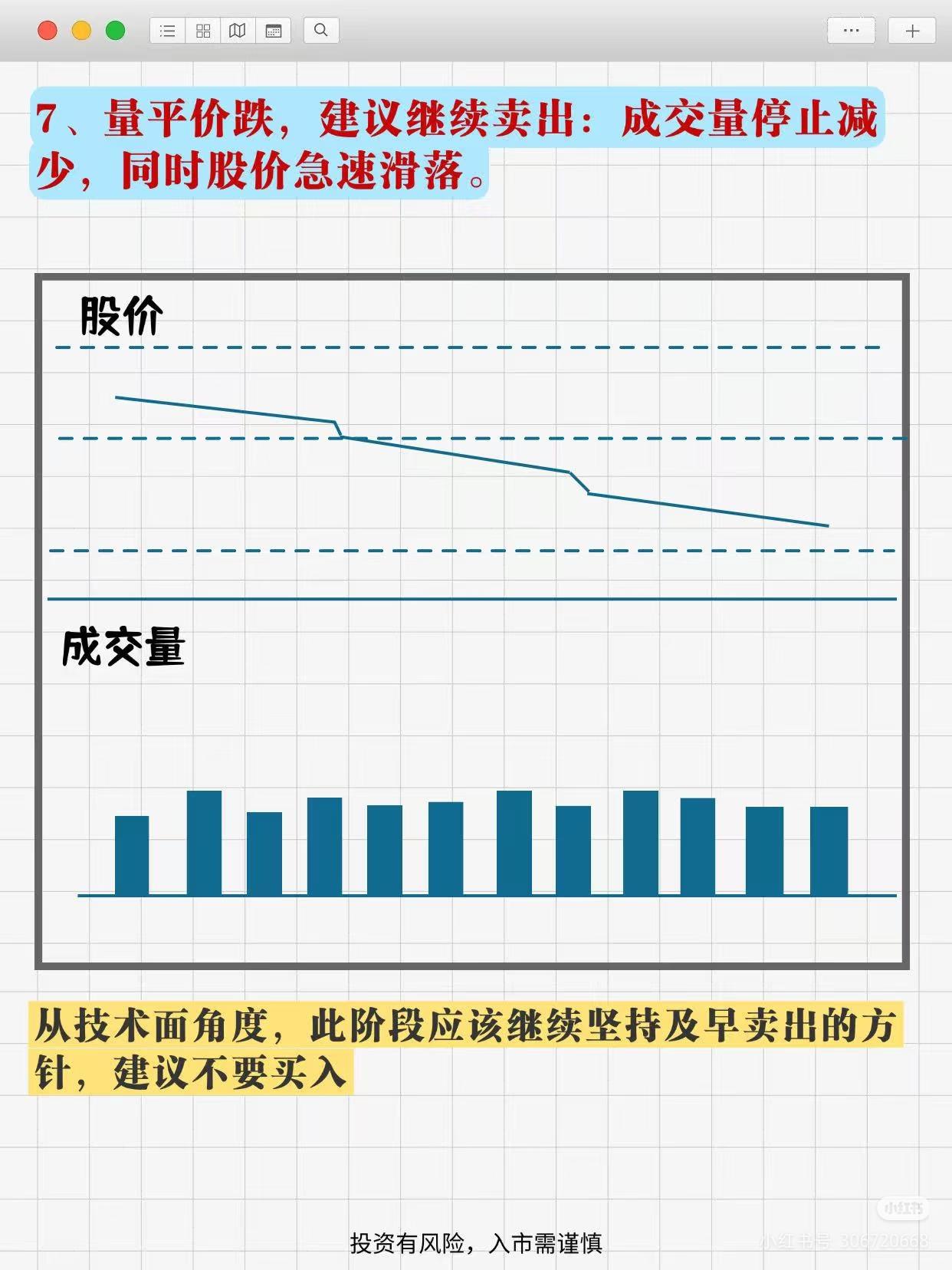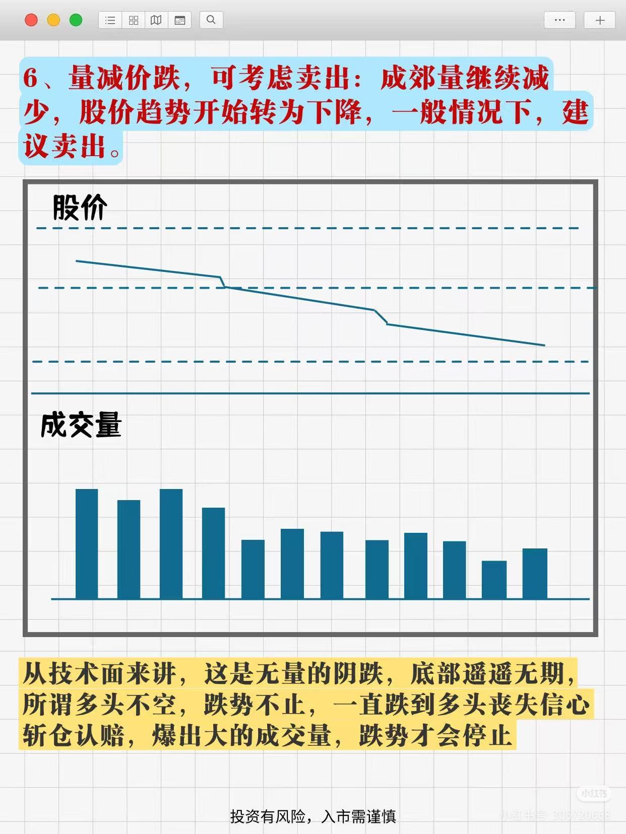 炒股知识分享,总结了量价关系的10种典型情况及操作建议,核心如下: 买入信号(3种) 1. 低位量增价平:低位企稳,成交量渐增(阳柱多),可适量买入; 2. 量增价升:成交量持续增加+股价上扬,中短期可买入; 3. 低位量平价升:缩量后成交量持平+股价上升,底部信号,可入手。 警惕/警戒信号(3种) 4. 高位量平价升:买方力度未增,虽能拉阳线但需警惕; 5. 量减价平:成交量显著减少,建议离场(小盘庄股可能是庄家出货); 6. 量减价跌:成交量减少+股价下降,无量阴跌难测底,建议卖出。 卖出信号(3种) 7. 量平价跌:成交量停减+股价急滑,继续卖出,勿买入; 8. 高位量增价跌:高位增量但价跌(庄股出货/大盘抛压重),果断清仓; 9. 量减价升:成交量减少+股价上升,可继续持有但仅限小资金短线(接近上涨末期)。 持股观望信号(1种) 10. 低位量增价跌:低位区成交量大增(有资金接盘),持股等解套/反弹。 所有内容均附“投资有风险,入市需谨慎”提示,强调技术面判断需结合风险意识。