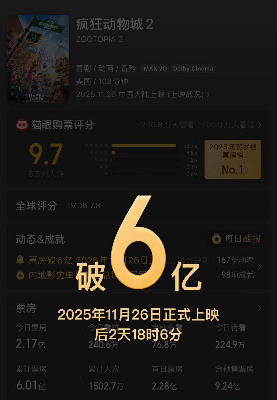 迪士尼电影的《疯狂动物城2》内地上映票房2天破6亿了,截止目前明天预售已经2.7亿了,感觉可以冲击3亿啊,明天单日票房5亿不是梦。 只能说今年全球电影市场都是动画片的天下,只能怪真人电影的质量太差了, 《哪吒》和《疯狂动物城2》证明了让不是电影市场不行,是电影导演没有好作品。