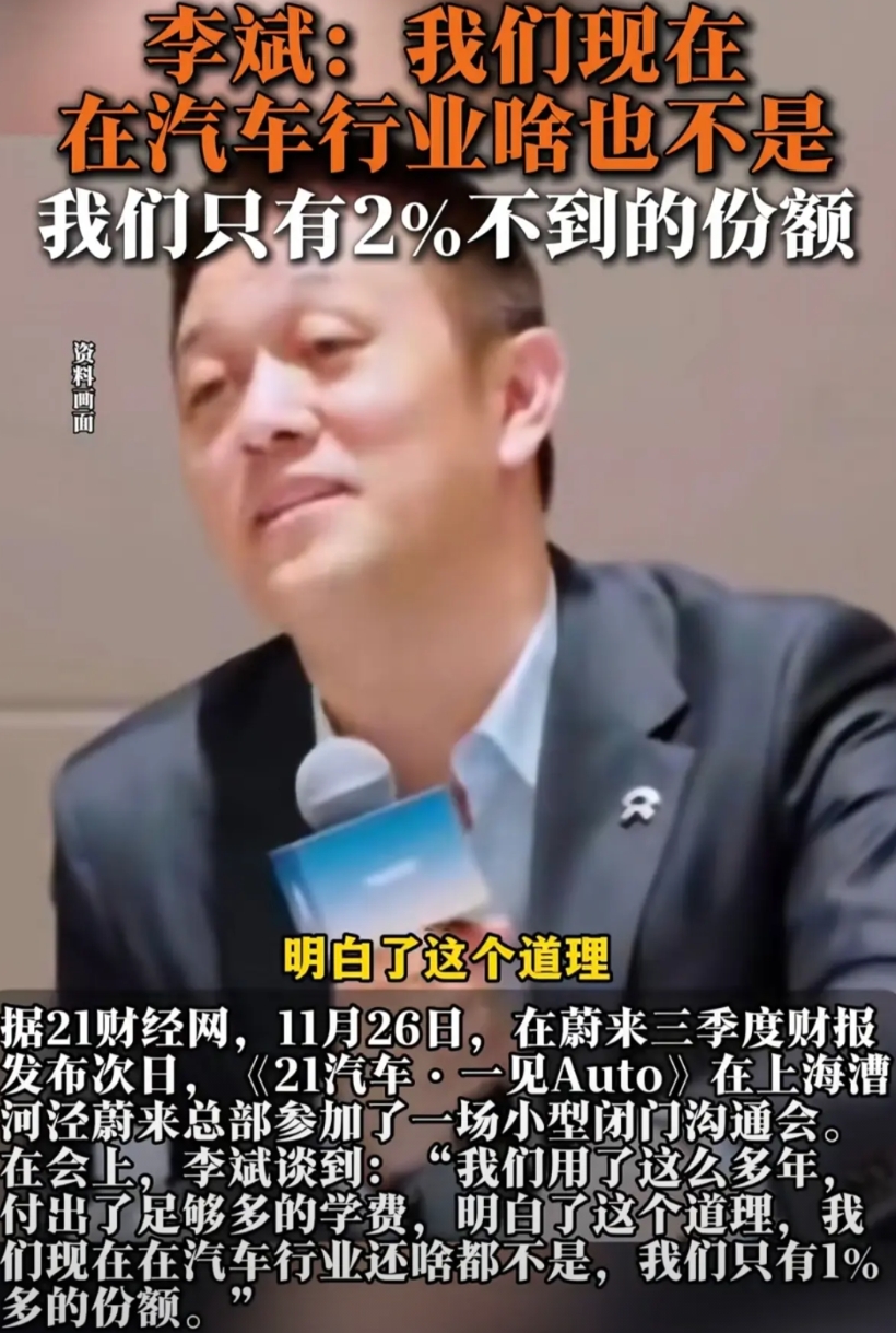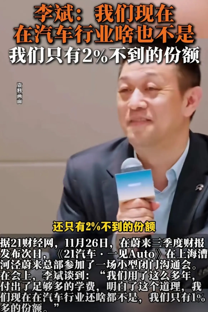 李斌的心态一般人根本比不了,他谈蔚来的成绩说着说着竟然哈哈大笑:蔚来用了这么多年,付出足够多的学费,明白了这个道理,就是我们在汽车行业,还啥都不是,还只有2%不到的份额。 蔚来长期聚焦30万以上高端市场,受众本就狭窄,还遭特斯拉、理想、赛力斯和小鹏等挤压 。换电站建设投入巨大致累计亏损超千亿,成本压力难缓解 。虽推乐道、萤火虫下探市场,但子品牌认可度低未达预期。且智能化落地慢于小鹏等友商,部分车型定位重叠,再叠加新能源市场竞争白热化,诸多因素使其份额难以提升,当前正处亏损收窄、全力推动多品牌走量的调整阶段 。 李斌却不服输,在提效、扩品、降本。推进CBU机制拆分经营单元,砍低ROI项目,优化供应链降本。推乐道、萤火虫下探市场,补全产品矩阵;加速换电站“县县通”,嫁接经销商渗透下沉市场。落地自研芯片等技术,同时布局全球化,目标2025年销量44万辆、2026年盈利。 大家为什么不买蔚来汽车,换电可是一流!