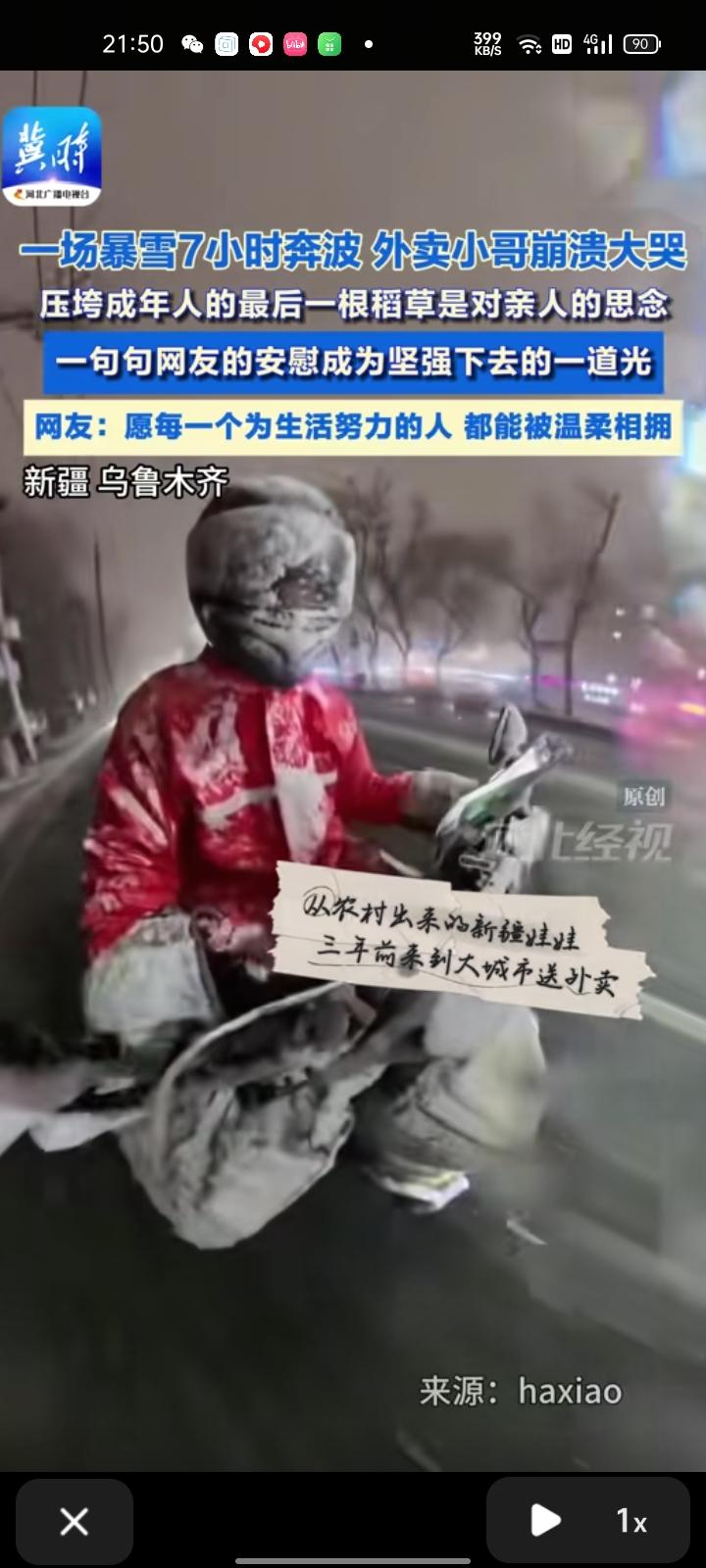 11月23日,新疆乌鲁木齐。外卖小哥在暴雪中奔波,连续干了七个小时,遇到了很多不顺心的事,心情不好而崩溃大哭。视频发出后,不少网友纷纷在评论区安慰,困难只是暂时的,缓缓就好。
