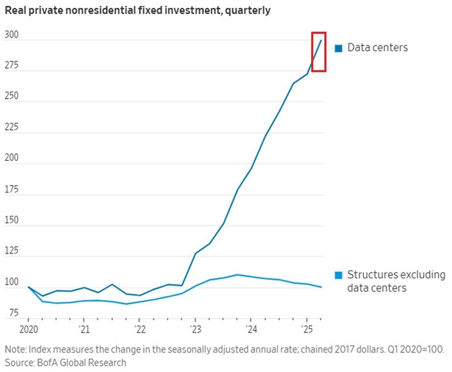 🔻BofA的数据显示,美国经济如今建立在AI行业之上:🔻过去三年间,美国私营非住宅数据中心的实际固定投资飙升了 300%。同一时期,扣除数据中心后经通胀调整的非住宅建筑投资几乎零增长。🔻这些建筑包括办公楼、购物中心、酒店、仓库、工厂、制造设施及其他商业地产。🔻与此同时,人工智能相关支出对 2025 年前 6 个月美国 1.6%的 GDP 增长贡献了 62.5%,即 1 个百分点。🔻若没有AI板块,美国经济将陷入衰退。海外新鲜事热点现场