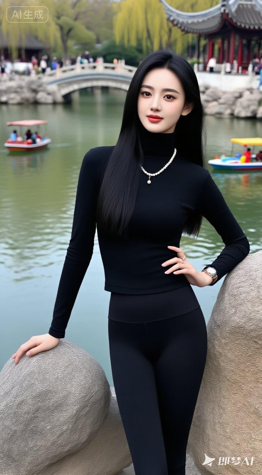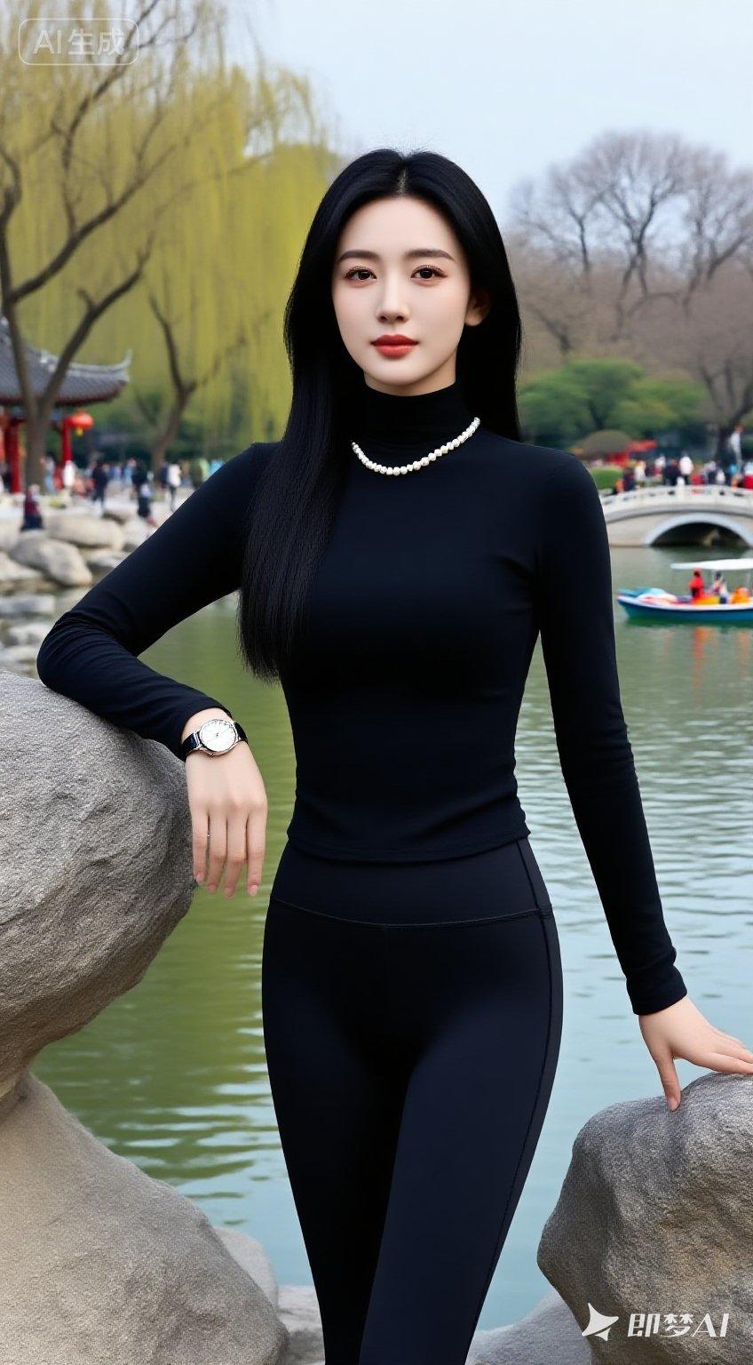 优雅黑衣少女,静坐湖畔,珍珠项链点缀,宛如画中人。
