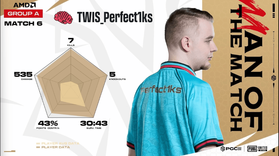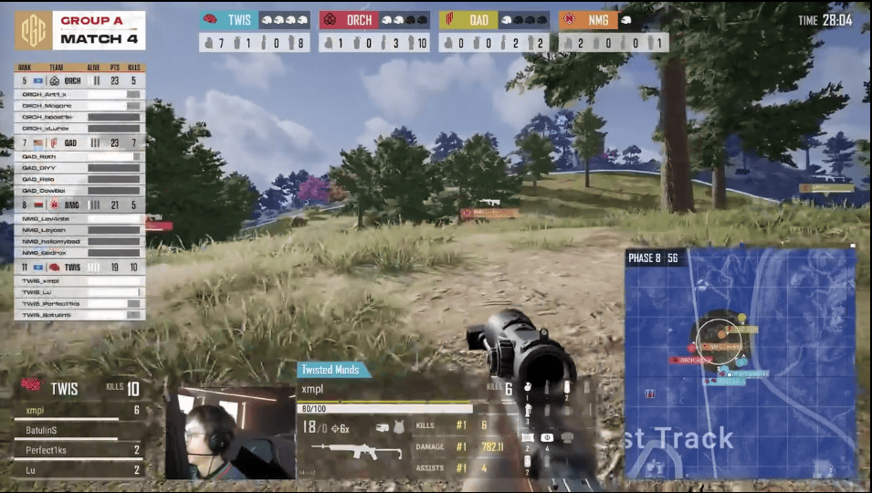 决赛圈,QAD独狼先被被蓝圈带走,随后TWIS利用人数优势持续推进将NMG与ORCH两队淘汰,TWIS成功吃鸡。