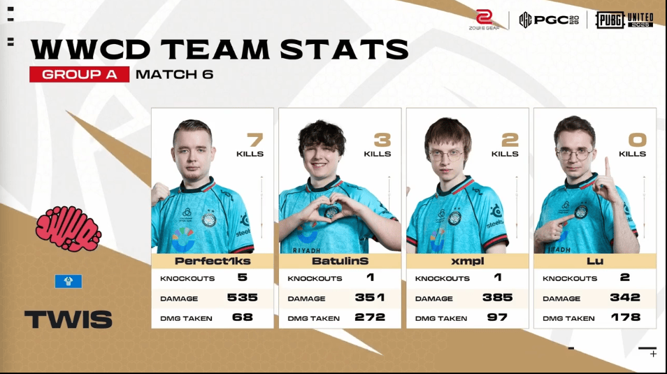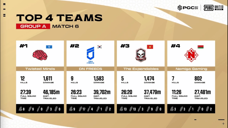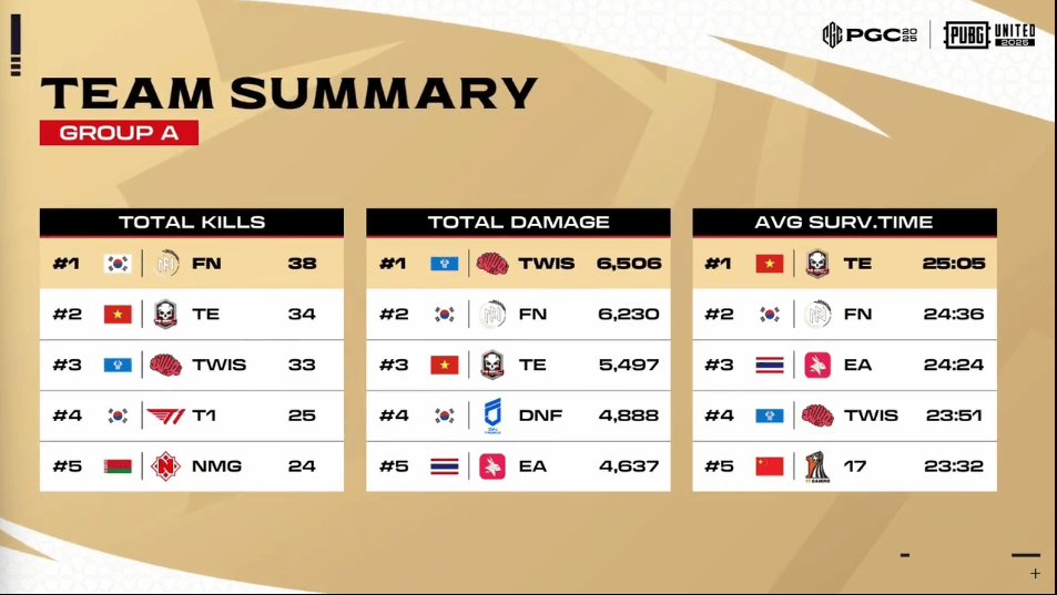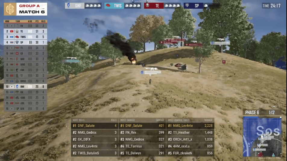 决赛圈,TE先与DNF交战,双方互换多人,TWIS抓住机会前来劝架,DNF先被淘汰,随后SP独狼也被蓝圈带走,最终TE与TWIS决赛圈大战,TE连续击倒TWIS两人,TE拿回人数优势,TE开车转移但被TWIS打掉,双方来到二打二,TWIS率先发现TE一人并击倒,TanVuu一打二不敌TWIS两人,TWIS成功吃鸡。