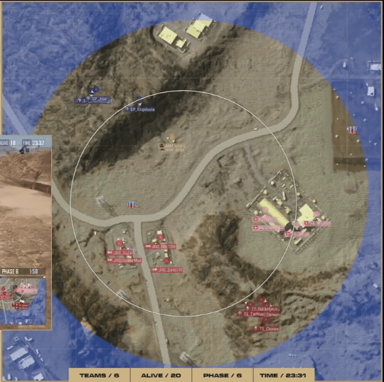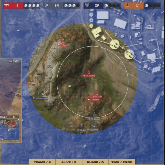阶段6,圈型刷在机场西北部山地,TE圈边将SP淘汰出局,同时DNF也将EA团灭。