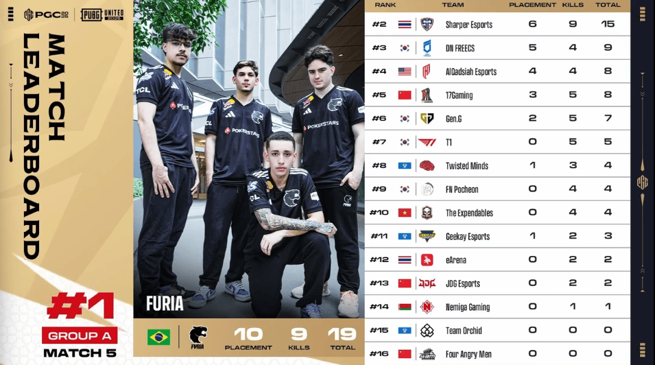 决赛圈,DNF出手击倒QAD一人,随后QAD另外一人被FUR淘汰。DNF开车冲锋但被FUR稳稳架住,DNF被淘汰出局,最终剩余FUR与SP两队,SP也开车冲锋,FUR手感火热将SP淘汰,FUR成功吃鸡。