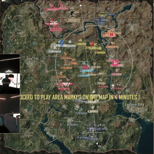 决赛圈,JDG独狼先被淘汰,随后TE打倒EA一人后被4AM淘汰。最终剩余EA与4AM两支队伍,4AM利用道具和枪线配合淘汰EA成功吃鸡。