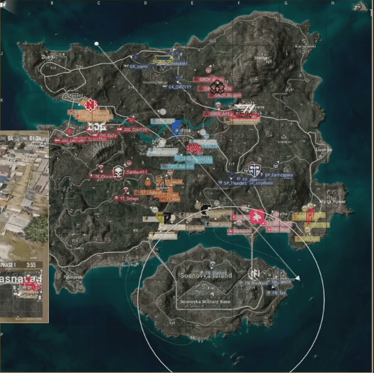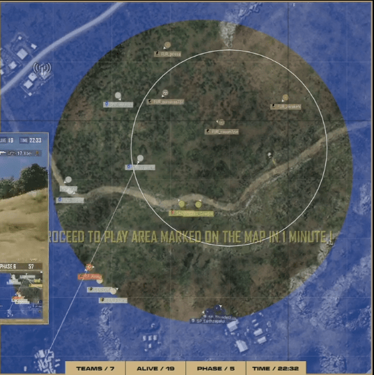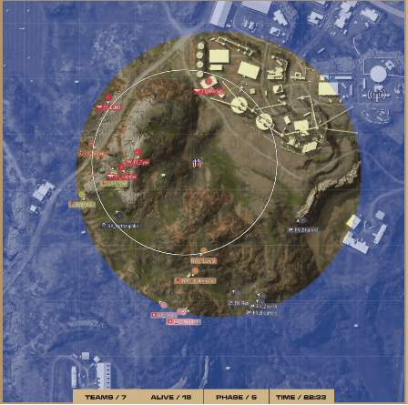 阶段6,圈型刷到S城西部土路附近。17打补GEN一人,GEN最后一人被蓝圈带走,随后17独狼也被QAD两人带走。
