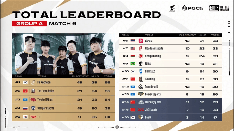 阶段6,圈型刷到轴承高地南部山坡,T1占据高点绝对优势,连狙连续抽靶拿下多分,圈边FN与EA发生冲突,FN依靠高点优势将FN淘汰出局。