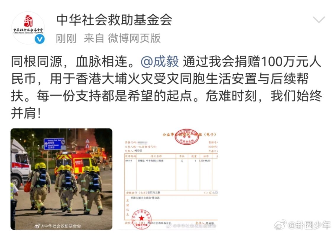 成毅向香港捐赠100万针对香港大埔火灾灾情,成毅献出100万人民币爱心捐款,助