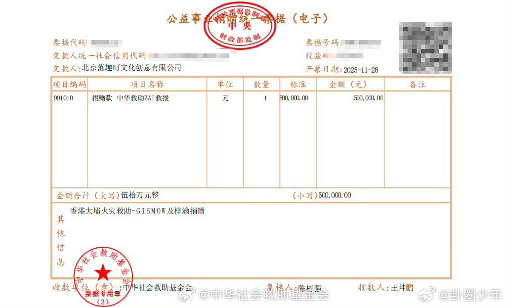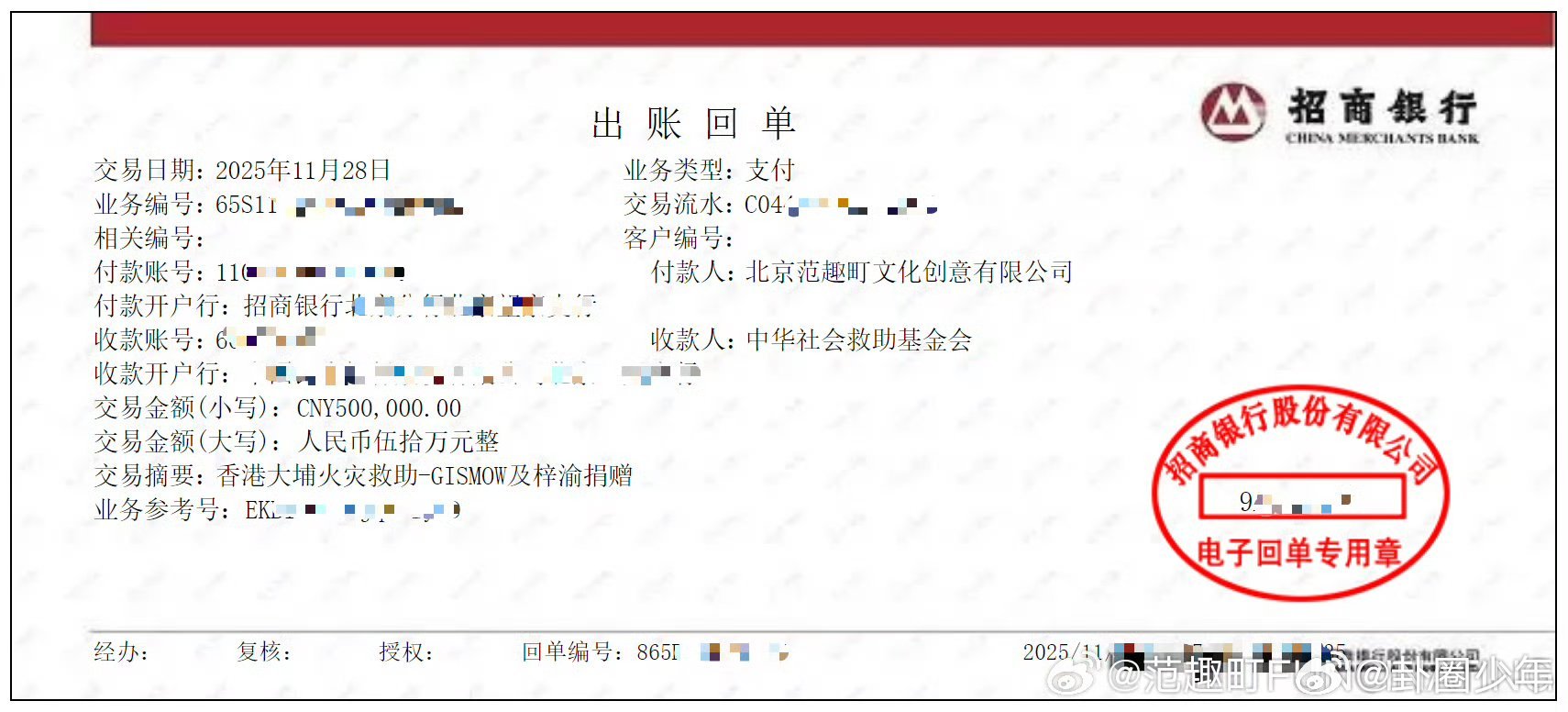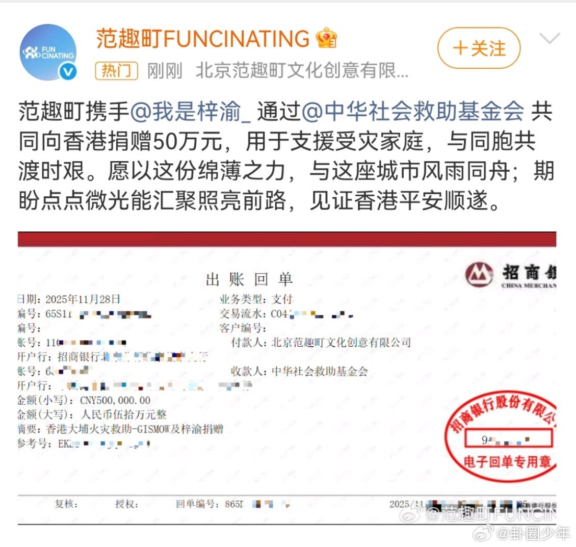 范趣町携手梓渝捐50万梓渝向香港捐款50万元 面对香港受灾情况,范趣町携手梓渝伸出援手,50万元捐款将定向用于帮扶受灾家庭,用实际行动践行社会责任。愿这份爱心能为受灾群众带去慰藉,助力香港尽快恢复平稳。