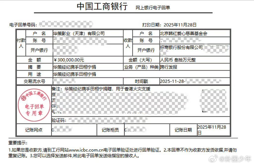 田栩宁香港捐款30万 针对香港大埔五级火警的救援需求,田栩宁以30万元人民币捐款响应支援,与社会各界的爱心行动汇成暖流。目前救援与善后工作有序推进,各类援助持续涌向受灾区域,愿受灾民众早日渡过难关。