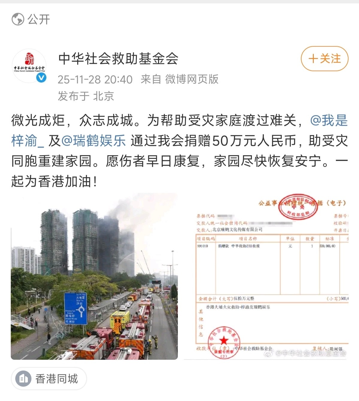 梓渝和梓渝粉丝都捐款了50w帮助香港正能量艺人和粉丝