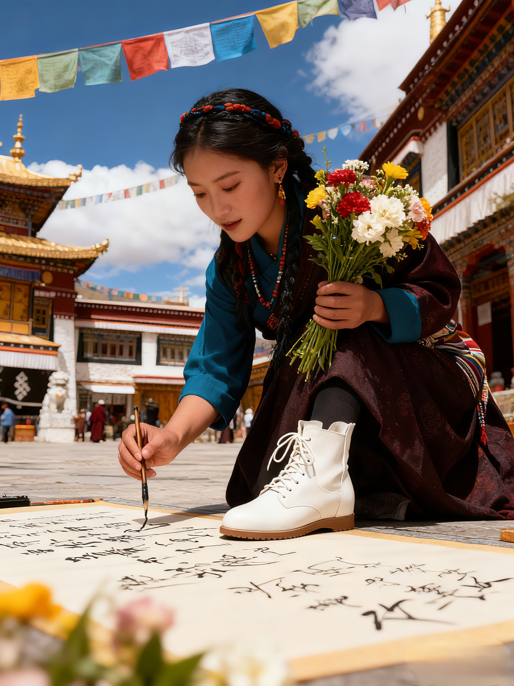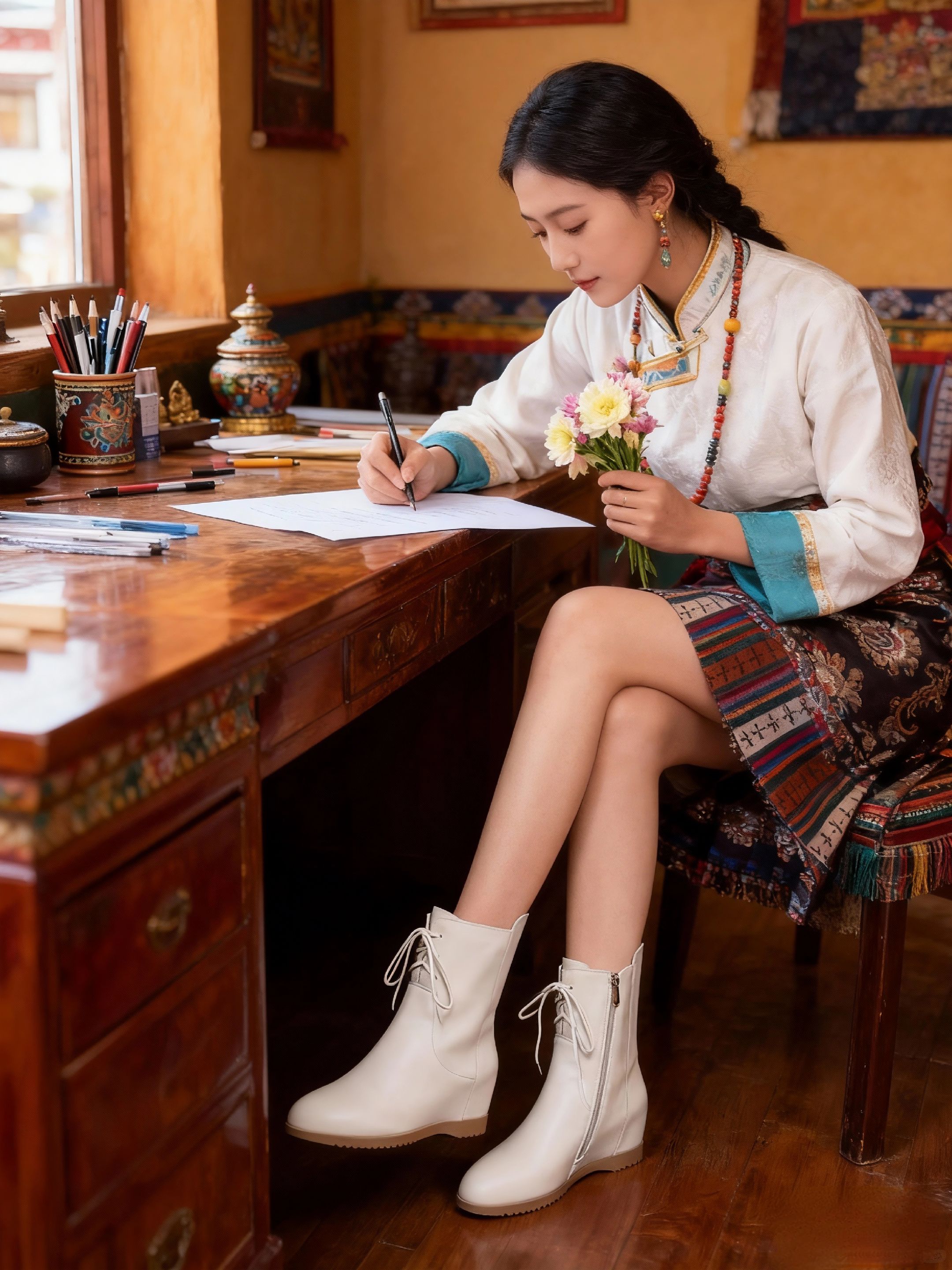午后她蹲在经幡下写经文,白靴抵着铺开的宣纸,花束蹭过鞋帮沾了点墨香。后来她踩着这双靴走转经路,鞋底碾过酥油味的石砖,像踩在阿爸编的氆氇垫上——这双靴,把高原的风,都裹成了步步妥帖的温柔。