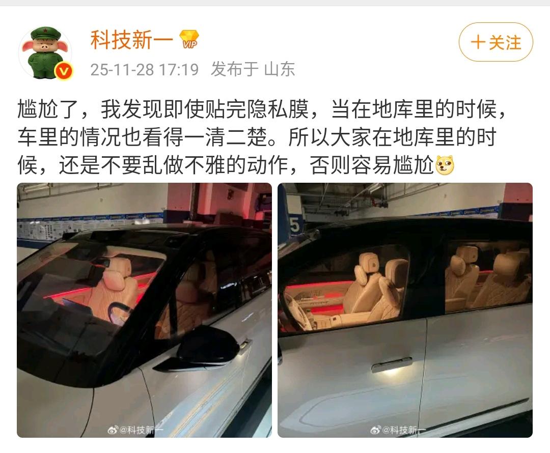 科技新一:尴尬了,我发现即使贴完隐私膜,当在地库里的时候,车里的情况也看得一清二楚。所以大家在地库里的时候,还是不要乱做不雅的动作,否则容易尴尬[狗头] 直接关灯不就行了吗?现在的车里面全都是氛围灯,即使不打开车灯的情况下,也是非常亮的。 现在的车屏幕也多,即使不开其他的灯,仅仅屏幕反射的亮度,也能把人照得很亮。 各位是怎么看的?欢迎评论区留言。