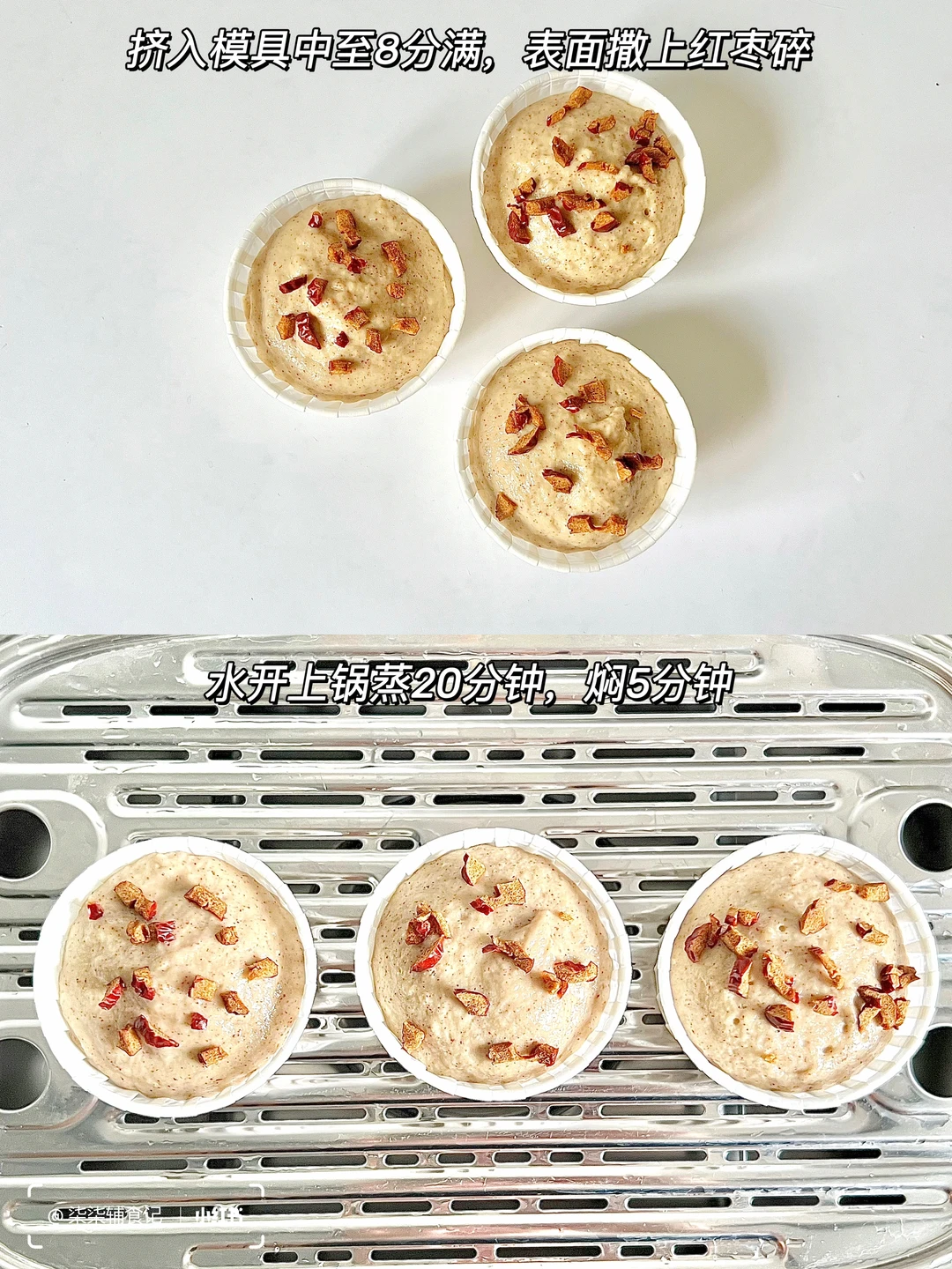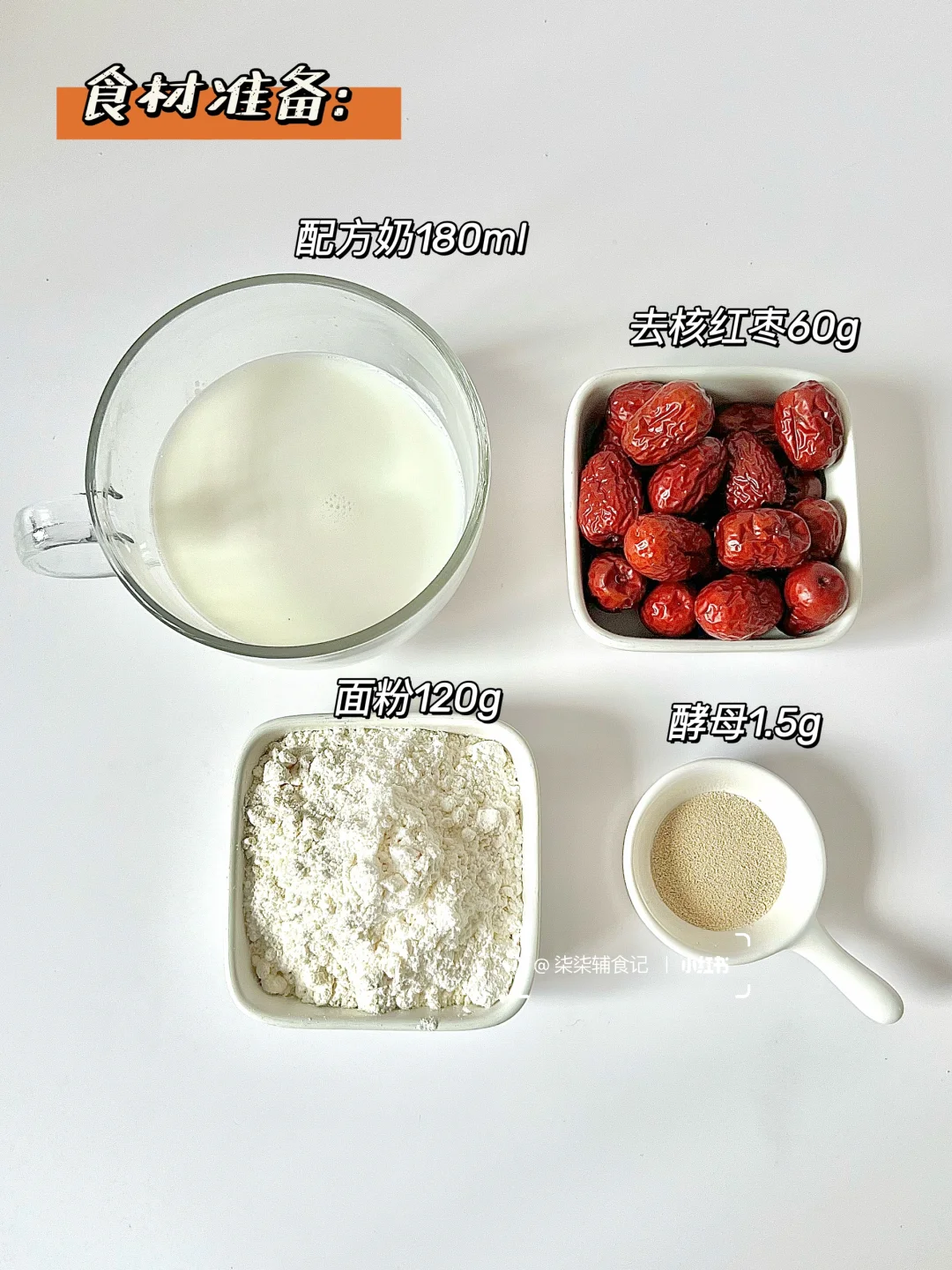 去核红枣60g、配方奶180ml、中筋面粉120g、酵母1.5g