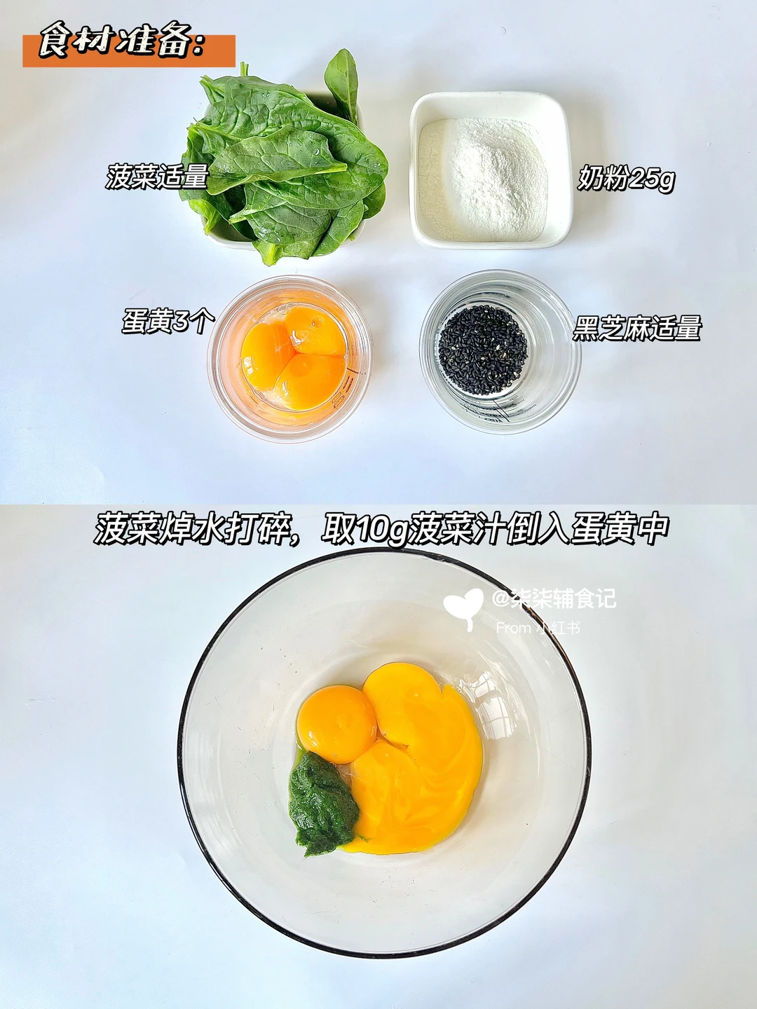 菠菜适量➕奶粉25g➕蛋黄3个➕黑芝麻适量