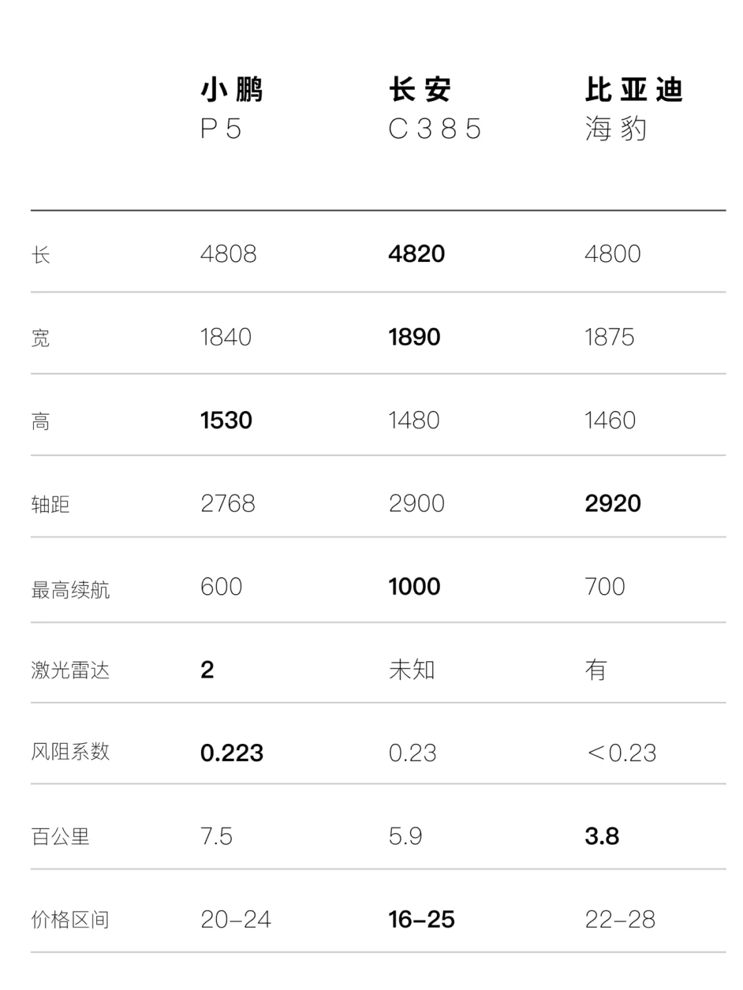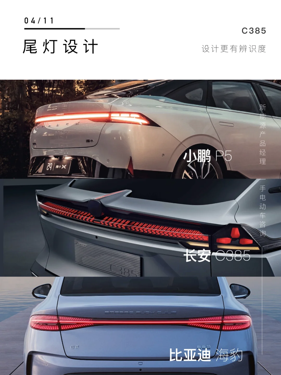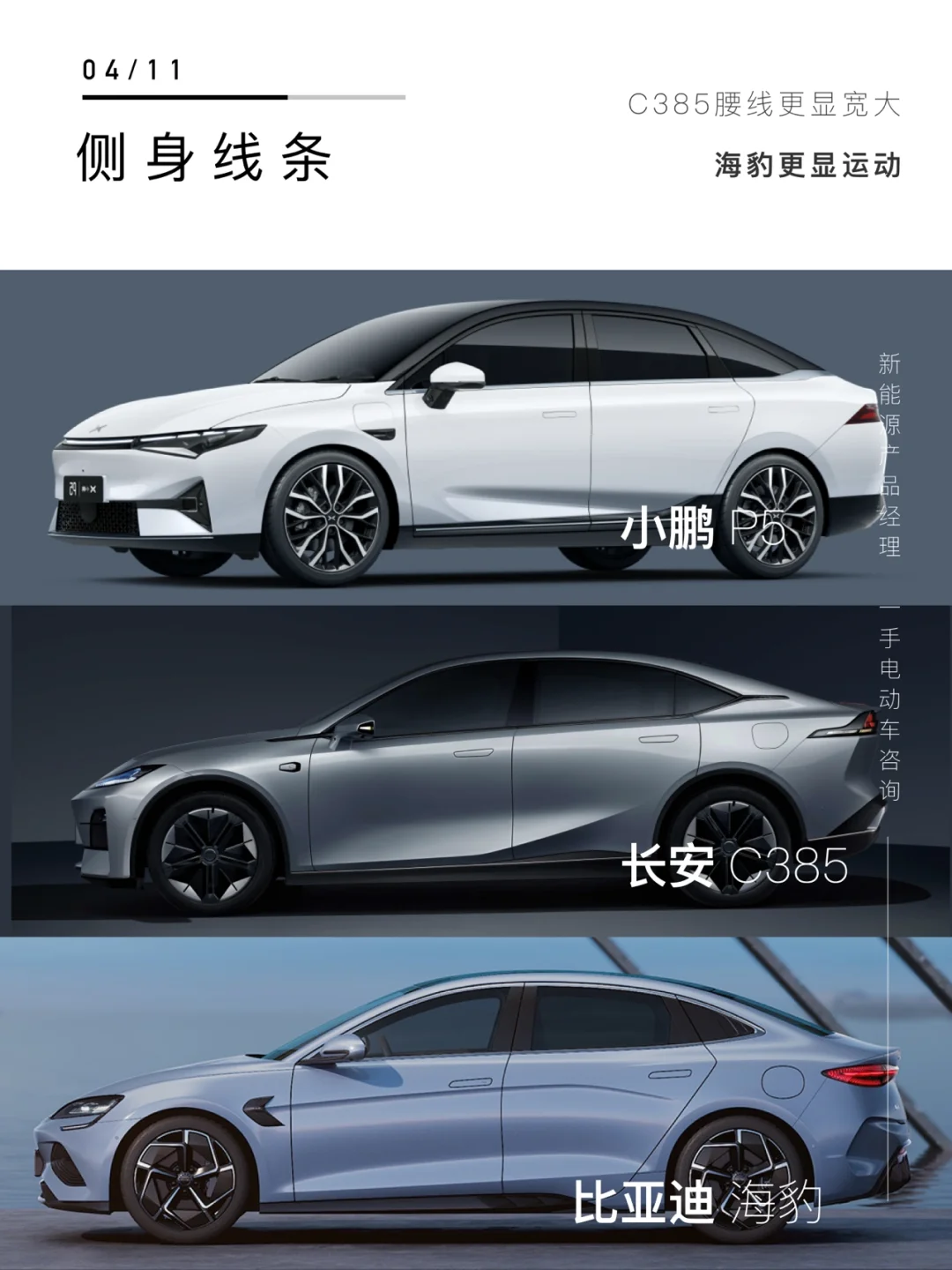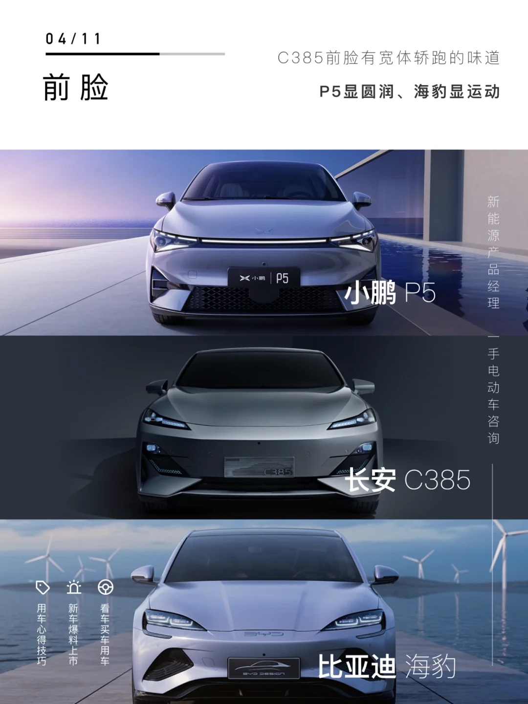 - 比亚迪海豹-综合3.8分 外观和性能参数都突出一个【运动感】 性能:5 外观:3 智能:4 续航:4 小鹏P5-综合2.6分 智能化程度较高 性能:2 外观:2 智能:4 续航:3 长安C385-综合4.2分 外观前沿,车身尺寸是亮点 性能:4 外观:5 智能:3 续航:5 我是新能源产品经理🦍猩哥 选购新能源车,知无不言,欢迎私信[微笑R]