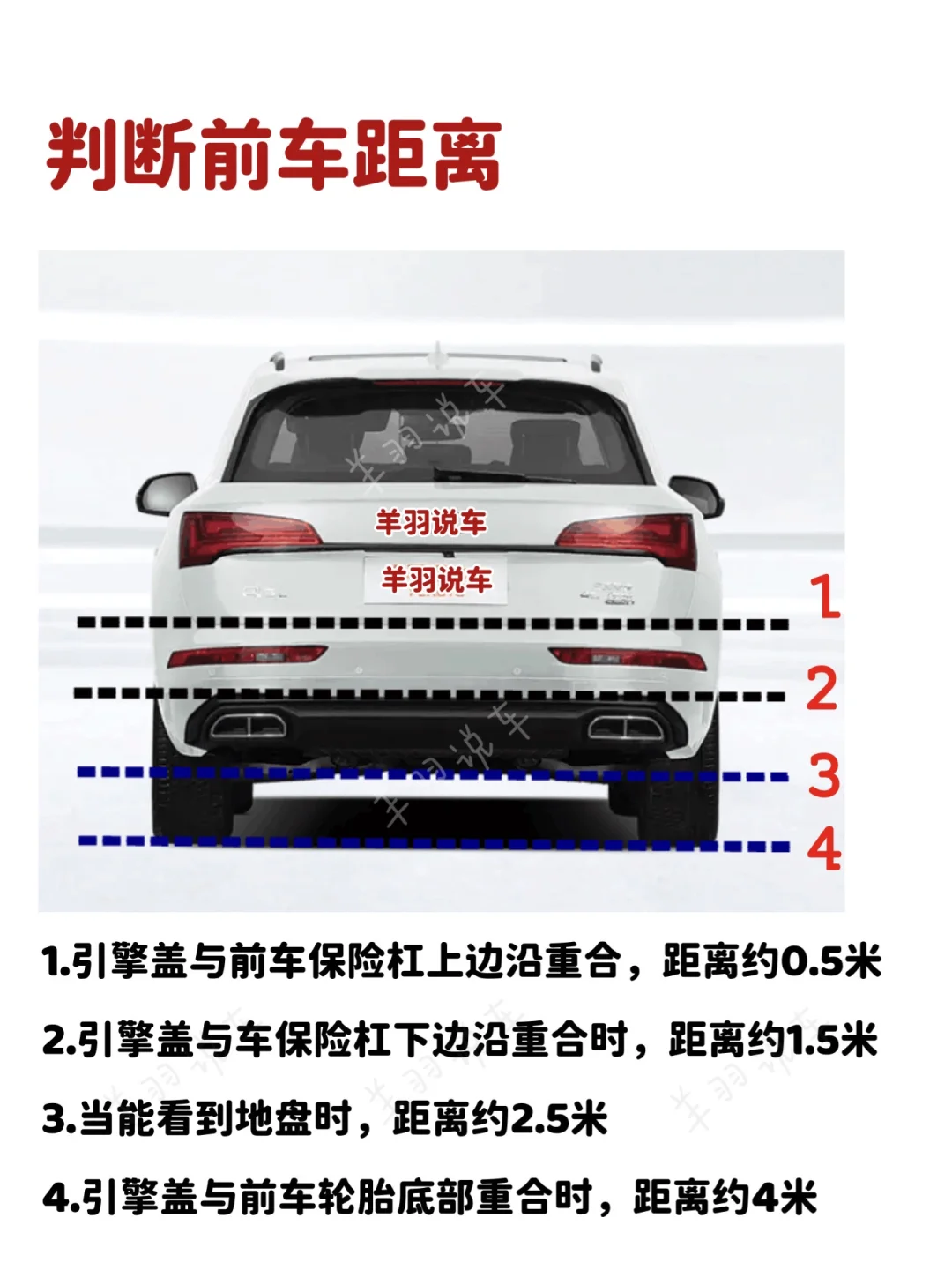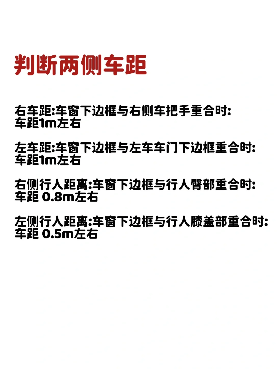 右车距:车窗下边框与右侧车把手重合时:车距1m左右