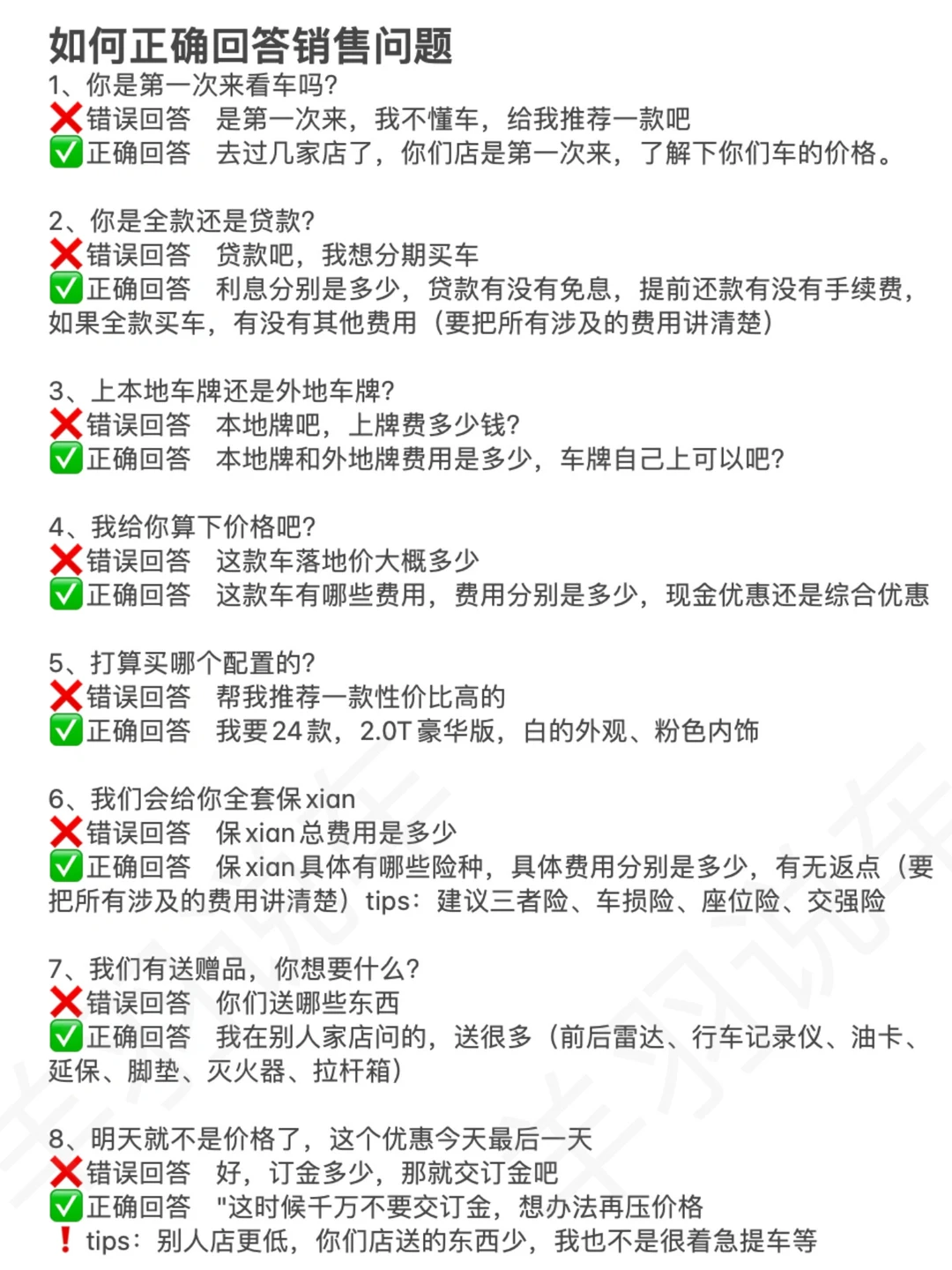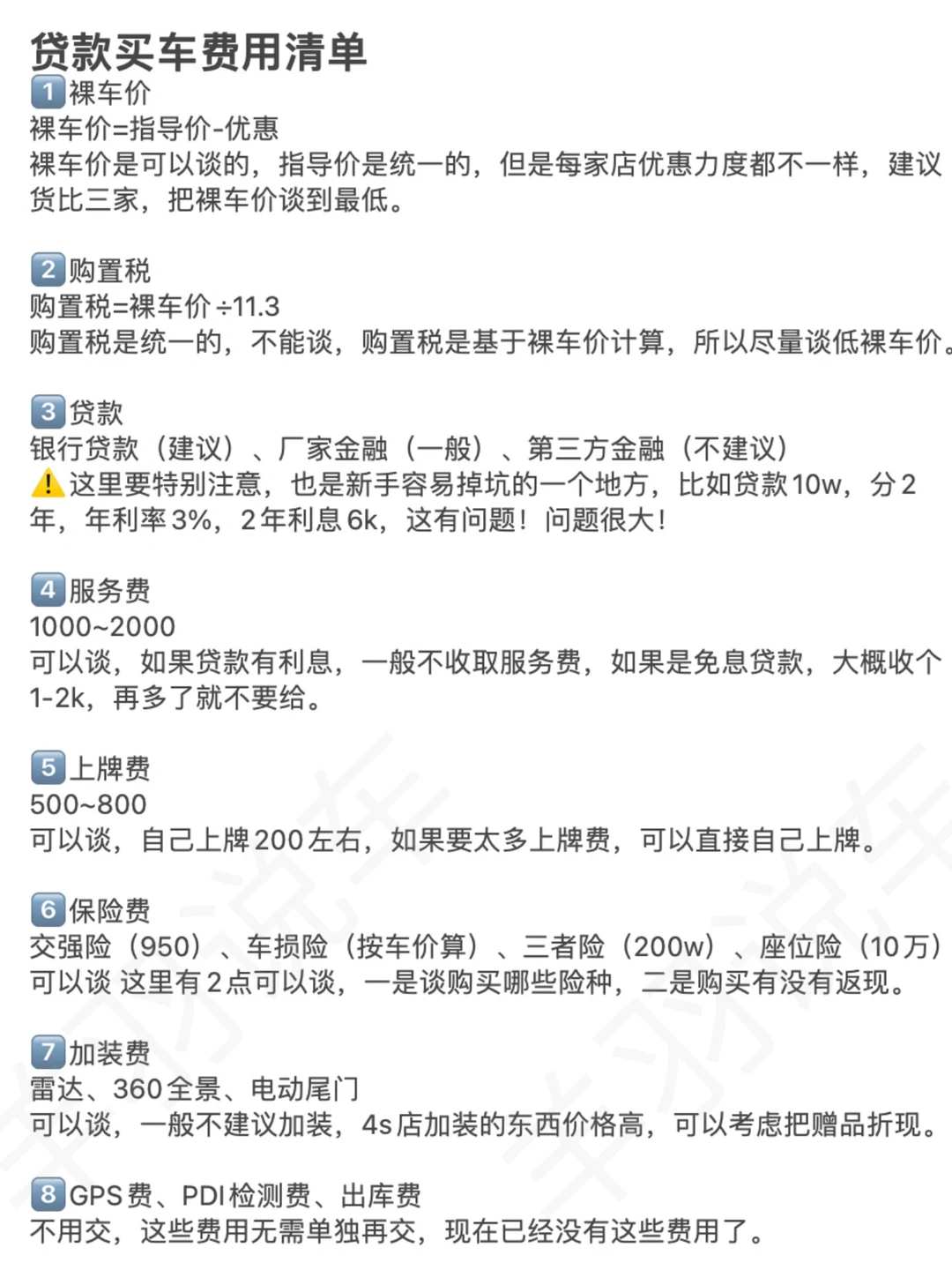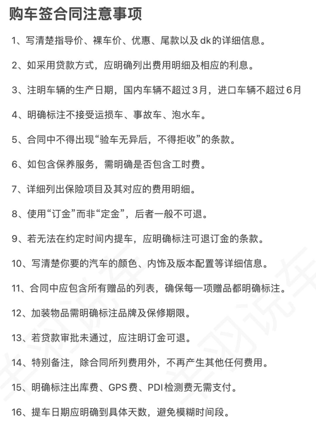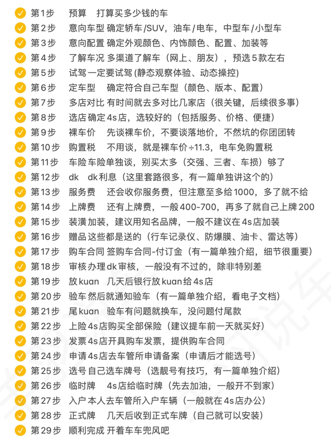 👱当代年轻人买车现状,一问一个不吱声,没关系,接下来你买车会非常顺! 图2⃣️:非常详细的买车流程,顺序不要搞反了。 图3⃣️:买车时,如何正确回答销售的问题! 图4⃣️:dk买车费用明细,别傻傻的什么💰都交! 图5⃣️:dk买车套路很多,仔细辨别,别被忽悠! 图6⃣️:购车签合同是重要的事情,要多加留意 图7⃣️8⃣️9⃣️:提车时的验车清单,有电子版,验车时打印出来,逐个核对!