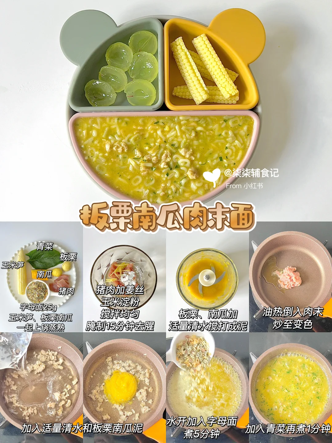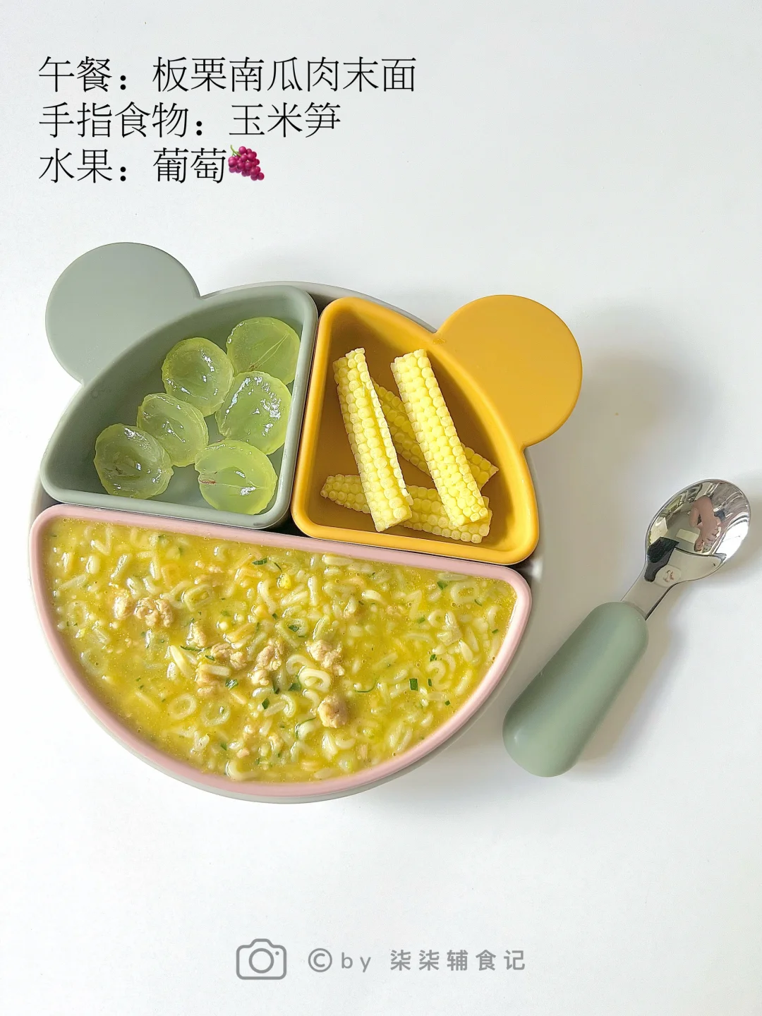 👧:11个月➕13天 ⏰:午餐11:00 🥣:板栗南瓜肉末面 🤌:玉米笋 🍽️:水果:葡萄🍇 ⏰:晚餐18:00 🥣:紫薯蛋黄烩饭 🤌:胡萝卜蒸糕 午餐板栗南瓜肉末面和玉米笋~第一次给柒柒吃玉米笋,上桌就一口接一口,根本停不下来!吃起来也是微微甜,淡淡的玉米清香也是很和柒柒胃口呀!面也全部吃光光👍 晚餐胡萝卜蒸糕和紫薯蛋黄烩饭,做了这么多蒸糕,每一款都不踩雷耶!香甜松软太好吃啦! ⚠️食材分量根据宝宝的食量添加。 ⚠️食材大小根据宝宝的咀嚼能力处理。
