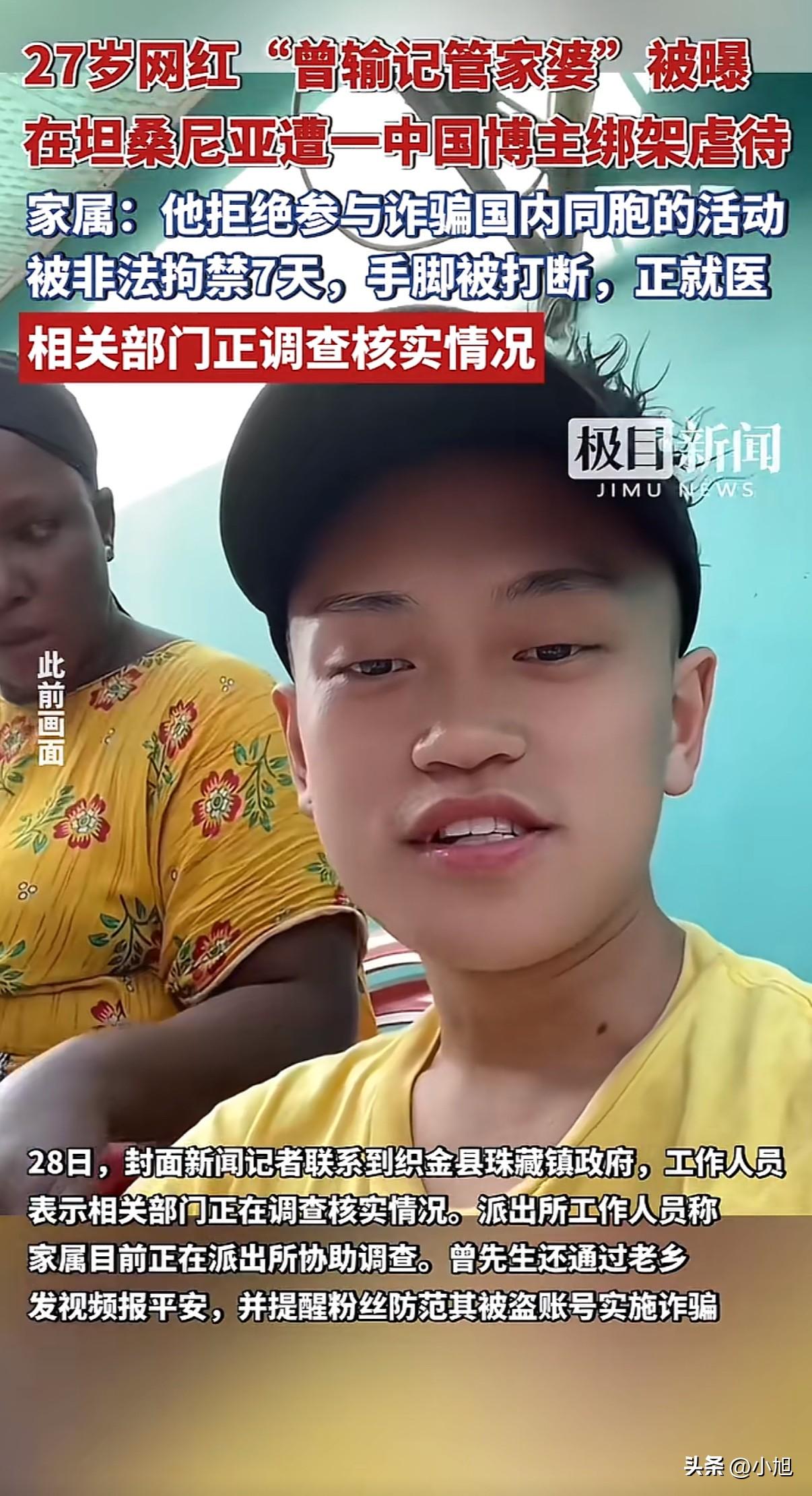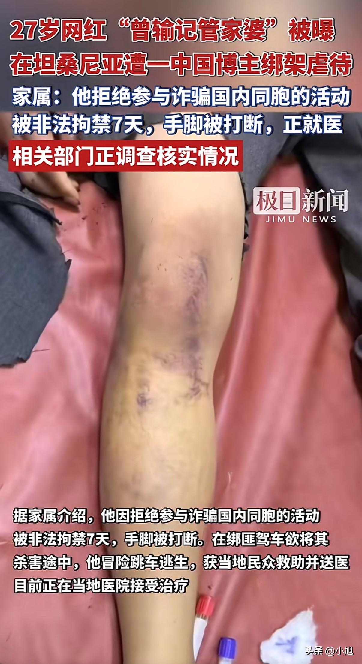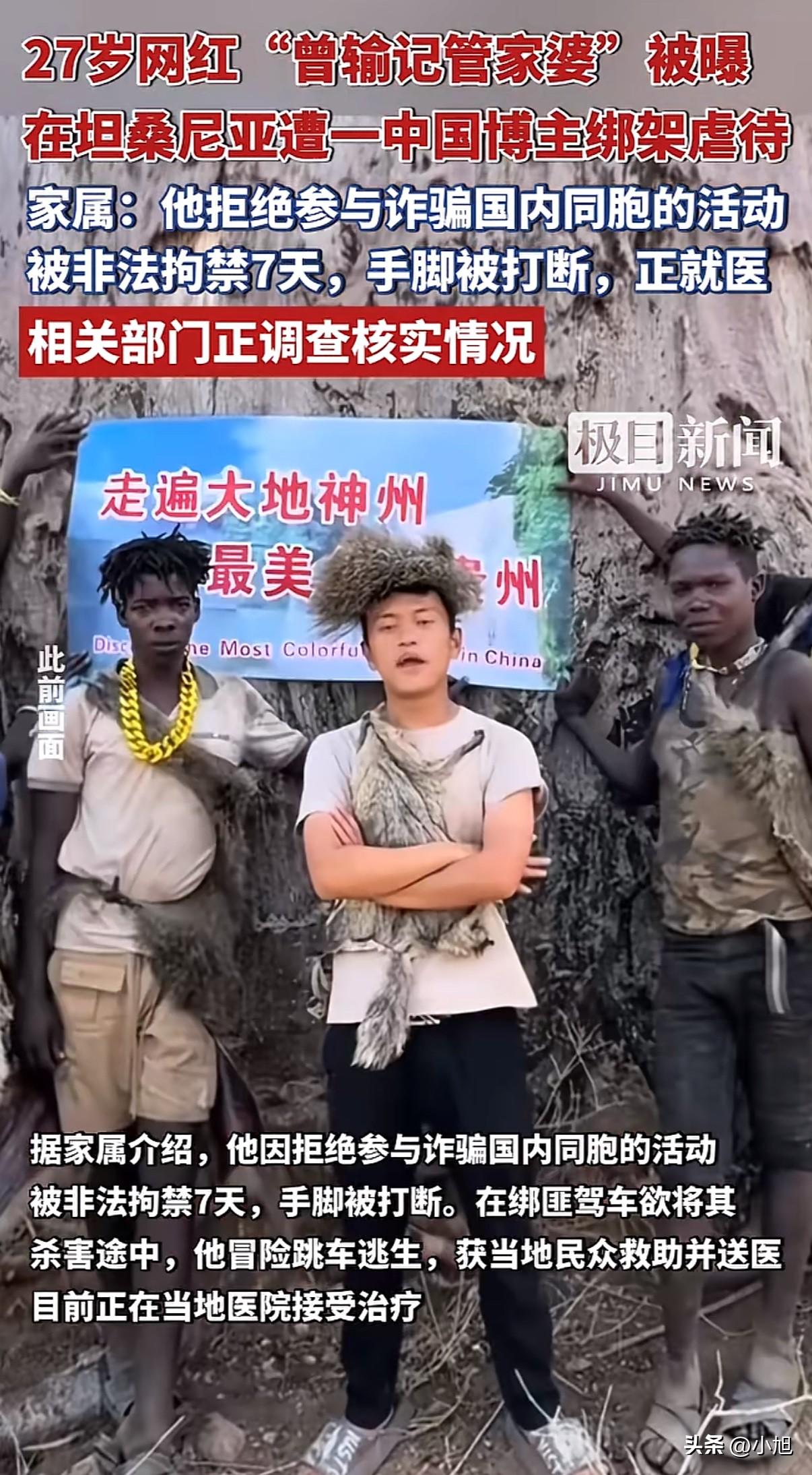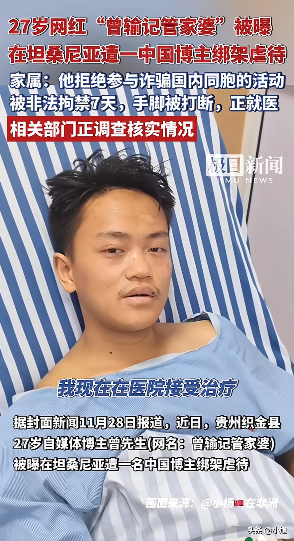贵州网红在非洲被绑架,因拒绝诈骗同胞被打断手脚!跳车逃生终获救 躺在坦桑尼亚医院病床上的27岁贵州博主曾先生,手脚裹着白色绷带,全身多处淤青,他用微弱的声音说:“希望尽快回国治疗,家里还有两个小孩。” 曾先生(网名“曾输记管家婆”)在非洲遭遇了一场噩梦。只因为拒绝参与诈骗国内同胞,他被一名中国博主绑架、虐待,非法拘禁七天,脚被打断。 这一切的始作俑者,是他在网上认识的、网名为“非洲洋洋”的中国籍视频博主赵某。 八九天前,赵某骑着摩托车在埃塞俄比亚找到正在旅游的曾先生,并把他带到了坦桑尼亚。两人开车前往一个偏远的非洲部落拍摄视频,然而这只是噩梦的开始。 01 凌晨袭击 当地时间凌晨4点,车子行驶到半路,赵某趁曾先生不备用胡椒水喷他,还用电棍对他进行殴打电击。 曾先生的脚被对方残忍打断,他甚至无法躲避或自卫。 这还不是结束。赵某掏出曾先生的手机,逼迫他在网上办理贷款,但未能成功。 赵某随后抢走了曾先生的手机、护照等个人物品,还把他银行账户里的1.8万余元转走。 02 胁迫与囚禁 更可怕的是,赵某威胁曾先生,要求他将家人、朋友骗来坦桑尼亚。 为了让这场戏更真实,赵某还强迫曾先生录制了一段“谅解视频”。 完成这些后,赵某将曾先生捆起来扔进汽车后备箱,随后关进一家旅馆囚禁起来。 这一关就是整整七天。 03 绝地逃生 在第七天,当赵某的同伙李某驾车将曾先生转移至不明地点时,曾先生意识到情况危急,冒着生命危险跳车逃生。 他大声呼救,引起了附近当地人的注意,最终获救并被送往医院。 知情人丁先生向媒体转述:“在原始部落拍摄完素材后,赵某就突然收缴了小曾的手机,限制其自由,并用电棍等进行虐打。” 04 八方援手 坦桑尼亚华助中心已介入协助,工作人员表示,他们已经把曾先生的口述内容整理为文字资料,经他确认后,将帮助提交给中国驻坦桑尼亚大使馆。 曾先生通过老乡发布视频报平安,并提醒粉丝防范其被盗账号实施诈骗。 在坦桑尼亚的华人也纷纷伸出援手,有人到医院看望他,有人垫付医药费,还有人帮忙翻译和联系大使馆。 05 家乡关怀 贵州织金县珠藏镇政府工作人员表示已知悉情况,相关部门正在调查核实。 贵州文旅官方账号也关注了此事,工作人员正对接商会,争取早日接曾先生回家。 曾先生家乡的政府人员表示,他们正在协调各方面工作,同时对当事人家里提供相关支持和帮助。 如今,曾先生躺在坦桑尼亚达累斯萨拉姆的医院里,身体多处淤青,手脚裹着绷带。他虽然无法下床,但仍坚强地说:“身体恢复得差不多了,希望能尽快回国接受治疗。” 而那名自称“非洲洋洋”的博主,已将短视频账号设置为私密状态,仿佛想从网络中彻底消失。 贵州网红非洲遇害事件引发广泛关注,背后折射出的是海外中国人的安全问题。