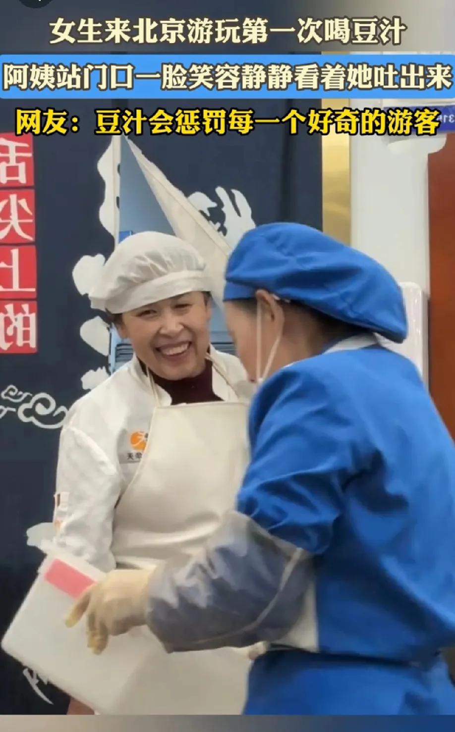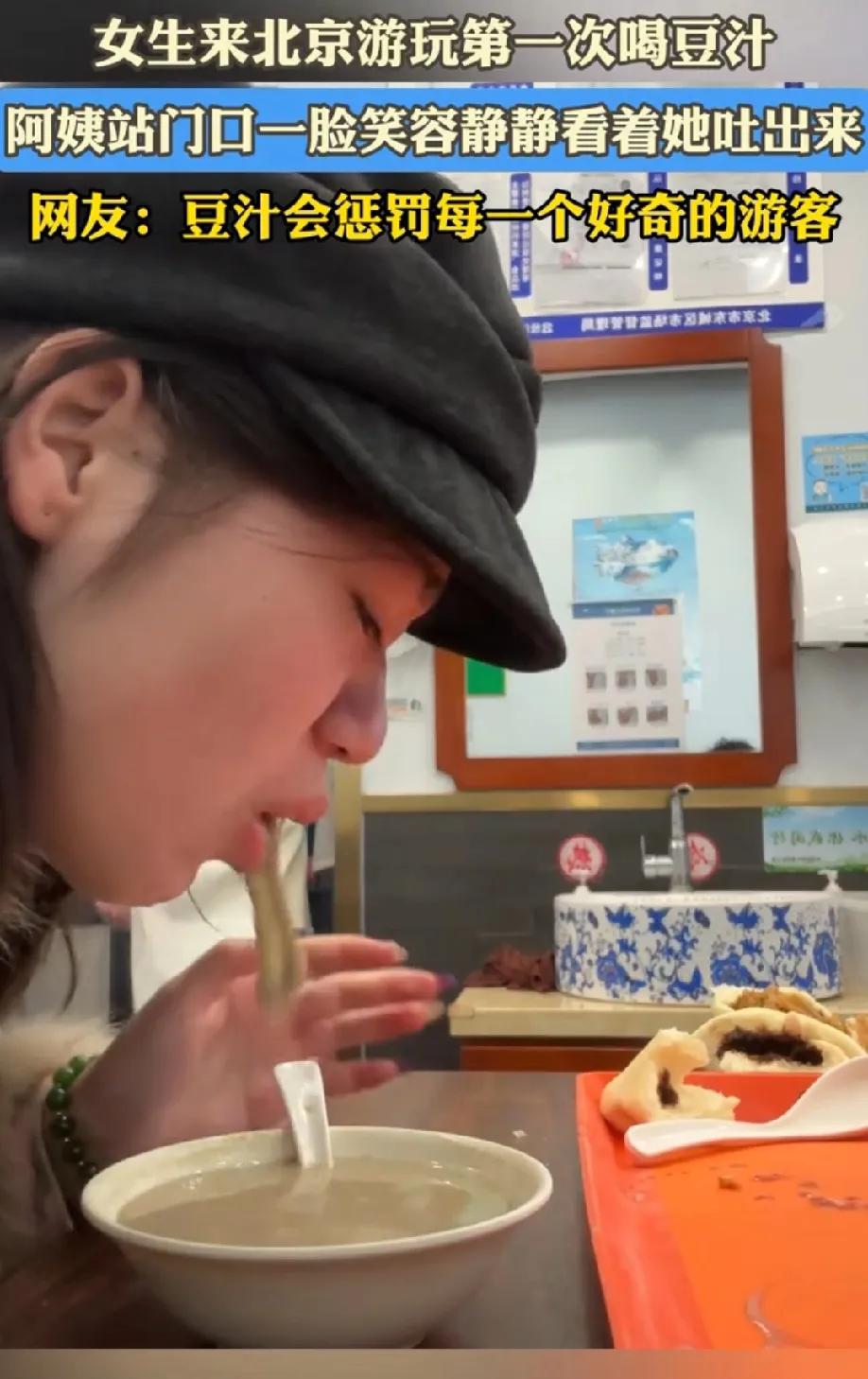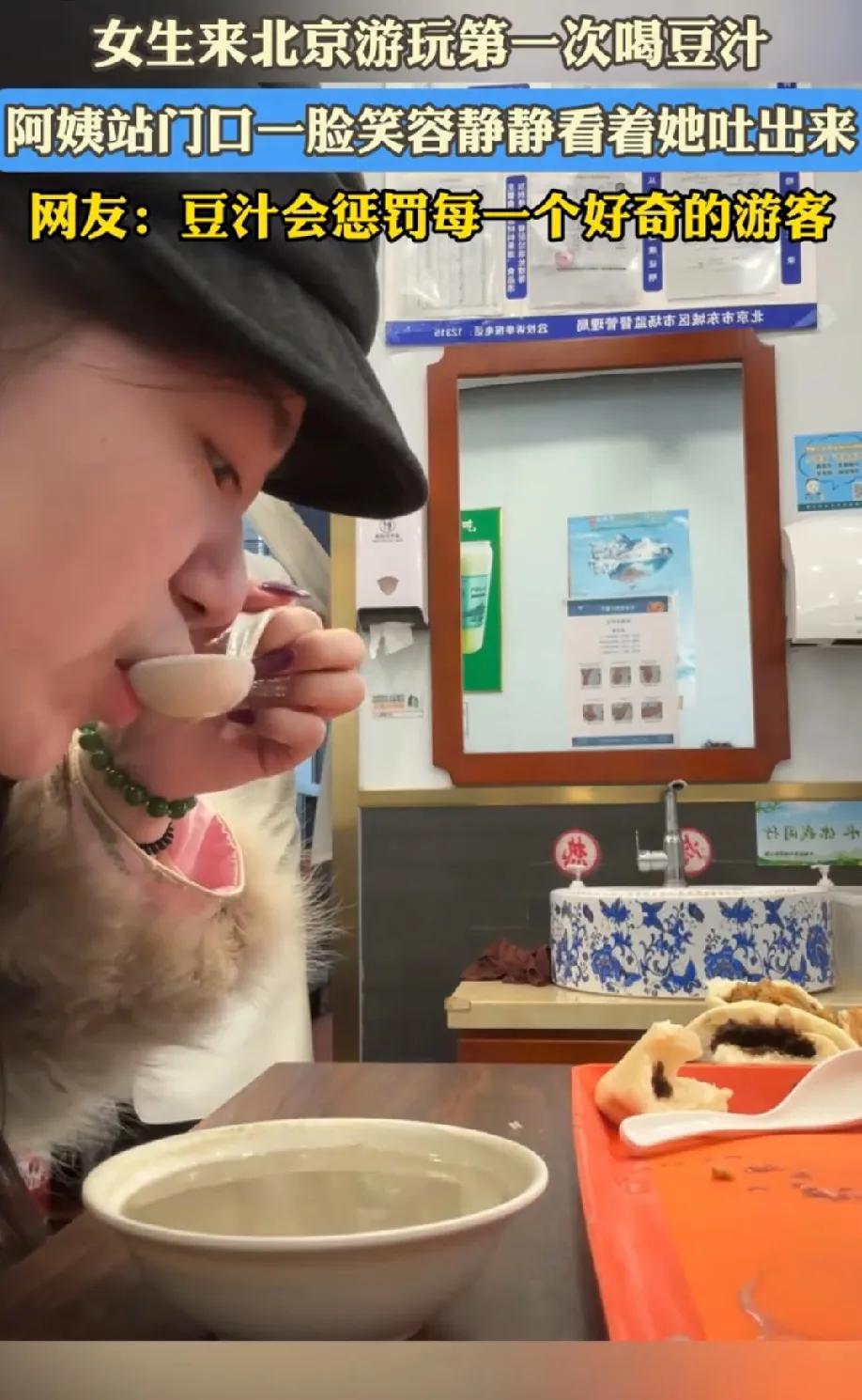 原谅我没见识,没喝过北京豆汁,想着去尝试,但是看了视频中的女生,马上打消念头。女生喝了一口,不到两秒钟,一反胃,直接吐碗里了,阿姨这脸上的笑,典型的看热闹不嫌事大。 这点了半碗,喝了一口,成满碗了。有点恶心,但是正常反应吧,总比吐地上或者桌子上要好吧。 肖战说是豆浆和酸菜鱼放了几天的味道,这味道,能喝得下去吗?所以生意全靠外地人好奇心和不服撑着? 建议下回出一口小杯子装的,试喝装,以免浪费!