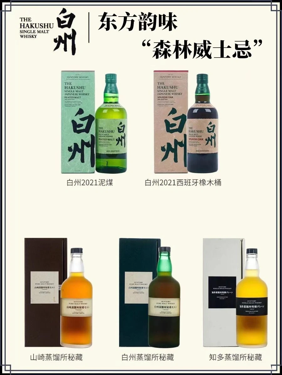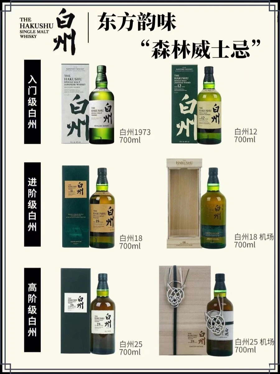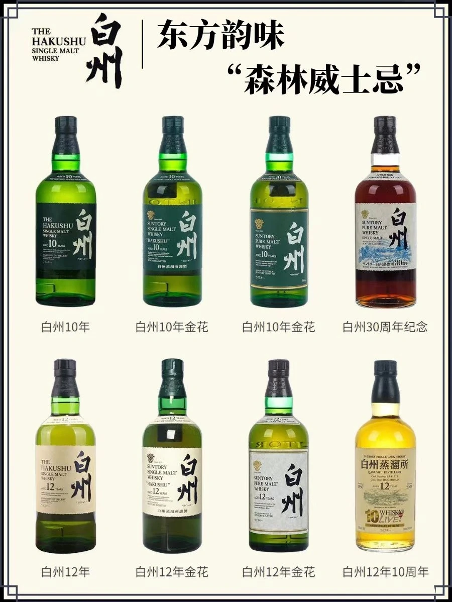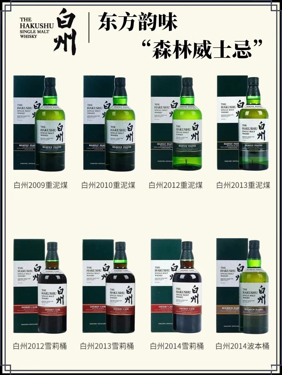 🥃白州有 4 款常规酒款,也有一些限定款,比如挑选雪莉酒桶熟成原酒融和而成的雪莉桶版本(Sherry Cask),以及挑选烟熏麦芽原酒装桶融和而成的重泥煤版本(Heavily Peated)等。此外白州也推出过私人酒桶系列(The Owner’s Cask)。