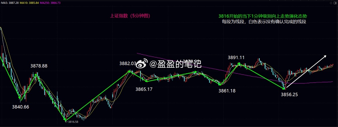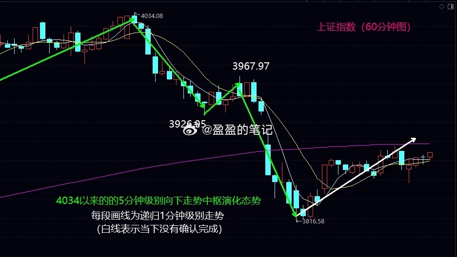 大盘下周初保留回补缺口的动能大盘今日早盘继续在当下中枢区间震荡后,最终在10.47分之后沿着中枢高点附近缓慢震荡爬升,力度虽然不够,但是靠着顽强的延伸,全天低点上来只走出一根新的反弹线段,并且以阳线高收在5日均线之上,继续保有下周初向上回补缺口的技术动能。当然,下周初不管是否回补缺口,其后震荡是避免不了的。只是回补缺口,就意味大盘震荡下行的动能会趋于减弱,而不能回补缺口,意味下周可以随时针对3816进行探底。不管哪种选择,今日反弹后,4034下来已经形成前后两个5分钟级别的扩展中枢(1分钟级别扩展为5分钟级别的意思),一般这种情况下,结合整体30分钟级别的中枢震荡,这个位置既不能过于看空,也不能一味看多。当下的底部扩展中枢将在1-3段的线段级别轮流交替处于中枢隆起和中枢震荡探底过程当中,这样一个过程,在不破3816新低情况下,要想当下把握震荡高点和低点,难度是非常高的。因此,一般人还是等演化结果更为清晰一些再考虑相应策略不迟。这种可上可下的中枢震荡位置,最终变盘选择是靠市场合力博弈出来的,绝不是什么可以精确预测出来的必然结果。当然,根据走势完美原则,4034下来还没有形成一个上下上重叠的标准5分钟级别反弹中枢,所以才有不回补缺口都不急的分析,只是小级别上,下周理论上可以随时回补缺口去形成这个可以完美的中枢结构