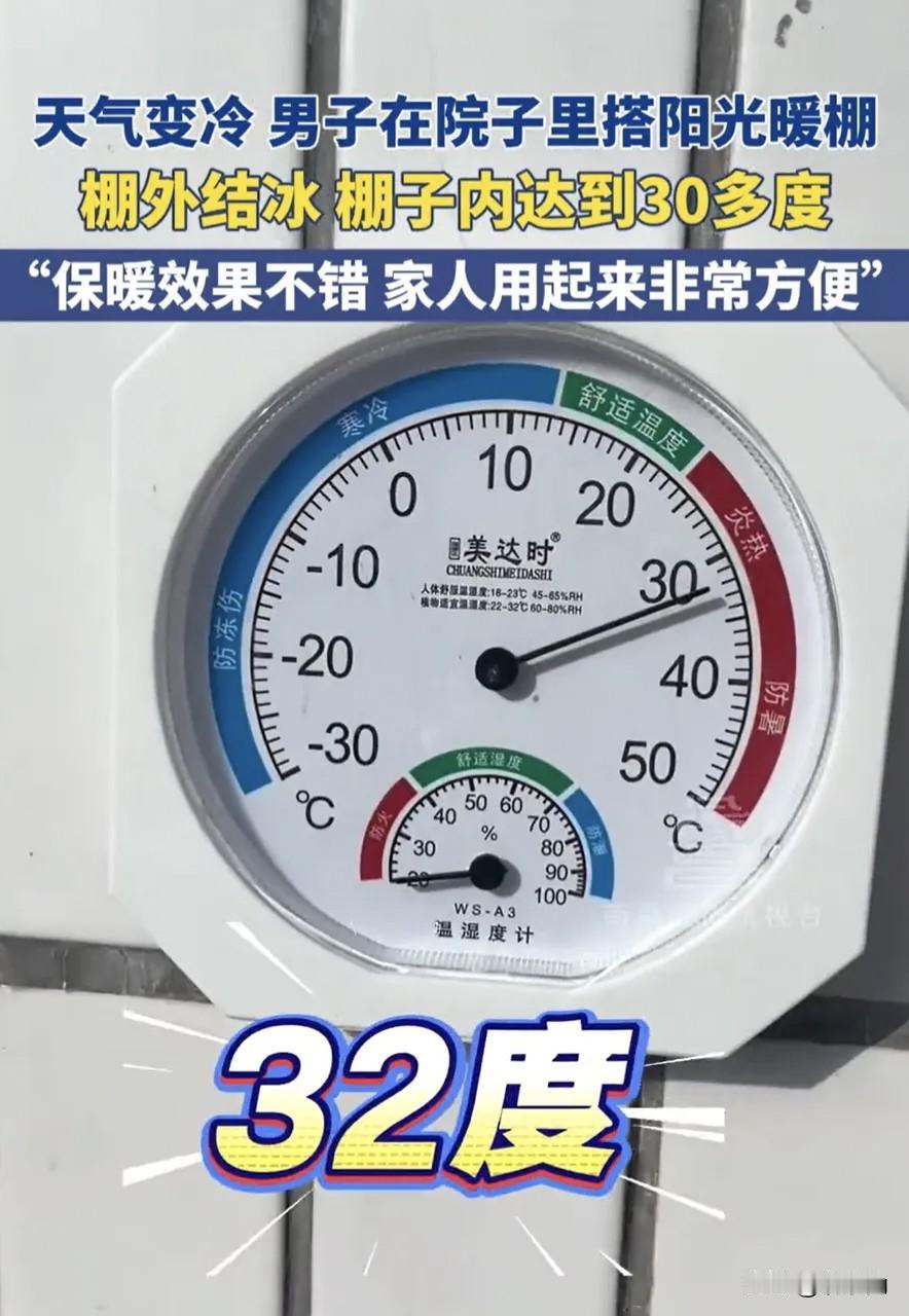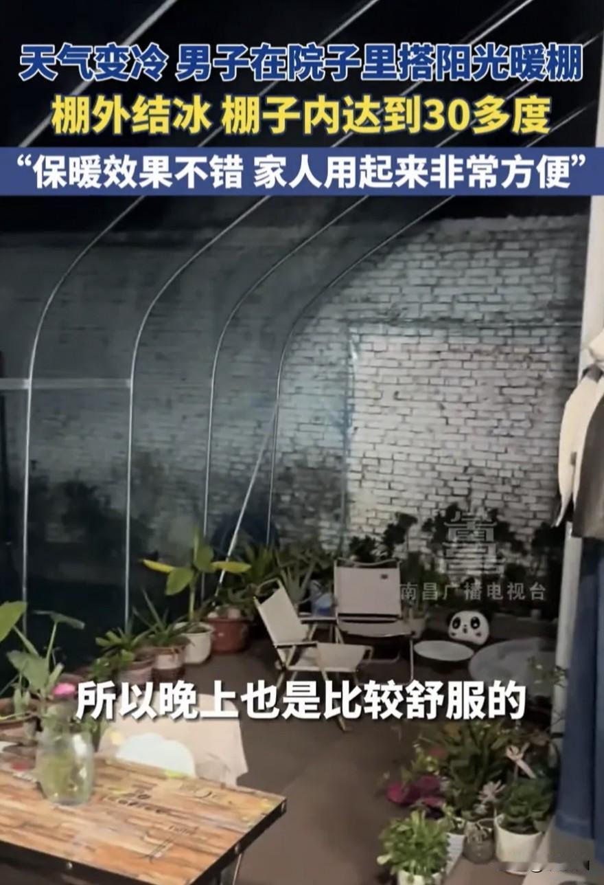 河北石家庄,刚入寒冬室外温度降到了零度以下,水管都结了冰,有位男子花费1000多块钱在自家院子搭建了一个阳光暖棚,没想到效果特别惊人,棚外边寒风呼呼地吹着还结着冰,棚里面的最高温度,居然能达到到30多度,网友:这关着不会有怪异的气味吗? 这几日石家庄愈发寒冷,外出穿上三层依旧能感觉到寒风往骨头缝里钻,居住在石家庄的王先生,看着院子里闲置的角落,心里盘算着并不可以搭建个暖棚,冬天不但能够晒晒太阳,还能够放置一些怕冷的花草,最关键的是不用花费太多钱财。 他并非从事装修行业,只是平时喜欢研究些生活小技巧,他上网查了不少资料,还向懂行的朋友请教了一番,算下来搭个简易的阳光暖棚,材料费也就一千出头,干脆就自己动手干了。 支架所采用的是轻便且坚固的铝合金管,不需要繁杂的固定方式,组装起来简便还省力气,棚顶与四周铺设的是加厚的保温膜,既能让光线透进来晒太阳,又能够紧紧地锁住热量,还专门留出了几个可以开合的通风口,就怕里面的东西被闷着了。 还真没想到搭建好之后效果直接超出了预期,最近石家庄室外最低气温都到了零下两三度,院子里的水盆都结了很厚的冰,然而一走进他家的暖棚,马上就有温暖袭来,他用温度计测了测,中午太阳好的时候,棚内温度居然能达到32℃,穿件薄外套都感觉热,平常在里面晒晒太阳、看看书,特别惬意,院子里的花草搬进去后,也长得绿油油的,一点没受寒冬的影响。 他把暖棚的视频上传到网络上,立刻就火起来了,网友们看完都纷纷夸赞厉害,这可太会生活,1000元就解决了寒冬取暖的大难题,比开空调还节约费用。 中午有30多度,晚上会不会降得过快,能不能在里面过夜存放东西。 有意思的是,不少网友关注点偏离,开始纠结棚内的气味,比如,密封这么严实,太阳一晒会不会闷出塑料味儿,长时间待着可以吗?花草和人待在里面,通风口够不够,会不会缺氧。 其实他老早就想到了这些问题,还特意选的异味的保温膜,平常白天太阳好的时候,会把两侧的通风口打开一半,这样既能保持温度,又能让空气流通,一点都不感觉闷,也没有怪气味,晚上温度降下来的时候,就把通风口关上,这保温膜隔热效果很不错,棚里的温度能保持在15℃左右,完全不用担忧花草会被冻坏。 后来有邻居上门来咨询,他也毫无保留地分享自己的搭建技巧,支架不用挑太贵的,铝合金管性价比最高,既轻便又能抗风,保温膜要选加厚的,透光性和隔热性都更好,还不容易损坏,通风口可是关键,至少得留两个,不然密闭空间容易出问题,成本也能控制在1000元左右,普通人自己动手就可以完成。 看看别人是怎么讲的,算过一笔账,冬季开空调取暖,一天下来电费好几10块,他这个暖棚一回投入1000块,能使用很多年,全依靠太阳能取暖,几乎不用另外花钱,既环保还省钱,简直是冬日生活的宝贝。 生活里的小窍门,其实常常就藏在这些突然出现的主意里头,不用耗费很多钱财,只要肯动一动脑子,就能把日子过成既舒服又有意思的状态,他的阳光暖棚,不但解决了冬天取暖的问题,还给大家提了个醒,过日子不用去追求奢华,实用又省钱的小创意,反而更能够增加幸福感。 有人觉得这暖棚,只适用于南方或者不太严寒的北方,实际上,只要选对保温材料、做好密封与通风,略微寒冷些的地域也可以运用,关键在于花少量钱办大事的思路,是10分值得借鉴的,你感觉这位男子的这个阳光暖棚实不实用,要是换作你,冬季会不会去琢磨这样的生活小妙招?