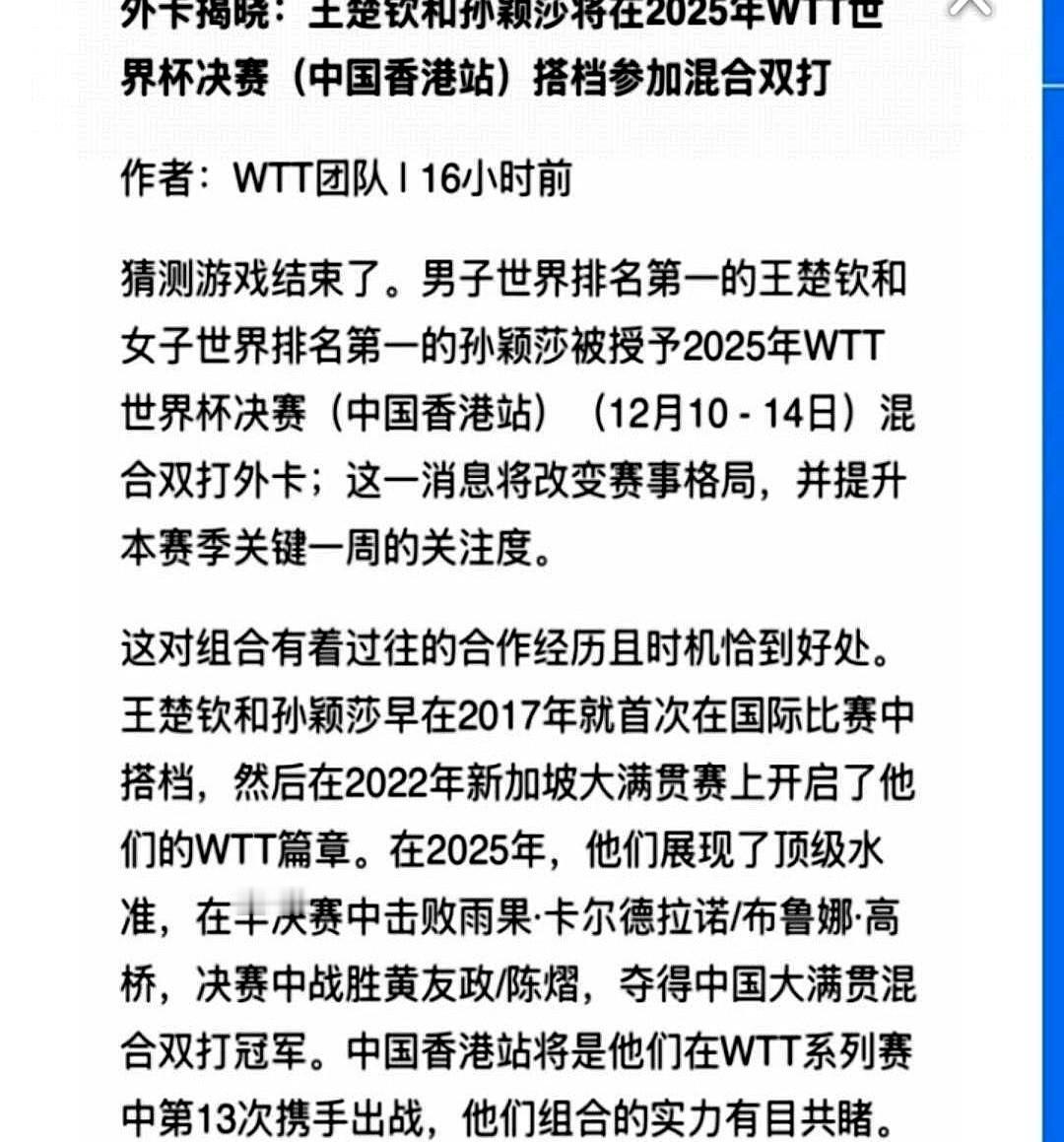 跟你说个有意思的事儿——莎头混双直接拿了年终总决赛外卡!别的混双组合攒了一整年积分,就盼着总决赛能去露个脸,结果这俩直接拿外卡进了。为啥?谁让这对“老祖”级的混双一出场就奔冠军去的,主办方干脆直接递邀请函。这下别的组合估计只能互相看看,琢磨着怎么争亚军了。这实力摆在这儿,确实没辙啊