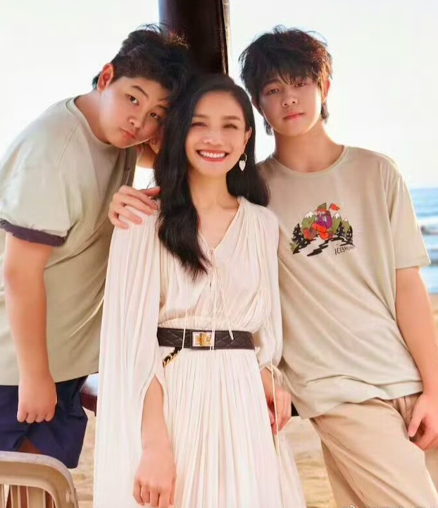 小儿子虽然没有大儿子那么壮,但看起来肥嘟嘟的,一边走小眼神还四处飘,小胖墩看到有人在拍还主要伸胳膊打招呼,可比一旁当几十年演员的妈妈外向多了。