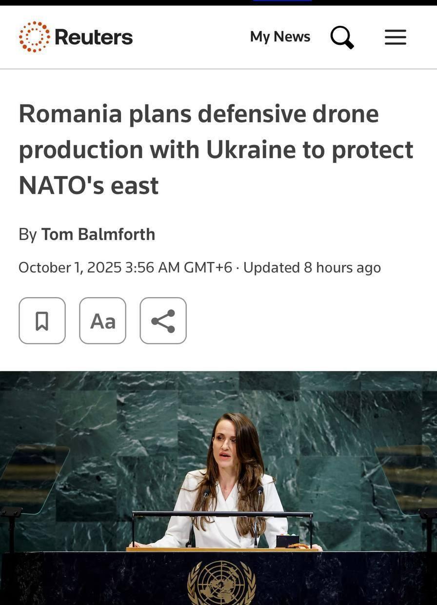 ‼️ 罗马尼亚和乌克兰将联合生产防御无人机——路透社 谈判甚至在该地区发生一系列与俄罗斯有关的侵犯领空行为之前就已开始。 罗马尼亚还批准增加美国在其领土上的驻军,以支持中东行动。 米哈伊尔科格尔尼恰努空军基地将扩建,以容纳多达 10,000 名罗马尼亚和盟军士兵。 🪖🪖🪖🪖🪖🪖