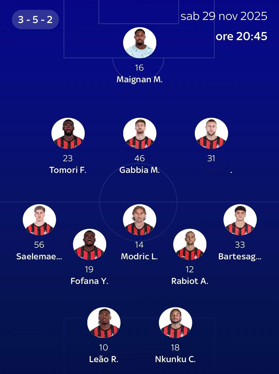 【Sky】该媒体给出的2025-26赛季意甲联赛 第13轮 -🔴⚫️米兰主场对阵拉齐奥队「预计首发阵容」(352):拉斐尔·莱奥🇵🇹、恩昆库🇫🇷组成双前锋;巴特萨吉🇮🇹、拉比奥特🇫🇷、莫德里奇🇭🇷、福法纳🇫🇷、萨勒马科尔斯🇧🇪组成五中场;帕夫洛维奇🇷🇸+加比亚🇮🇹+托莫里🏴的三中卫组合;Forza Milan!👊🏻sempremilan