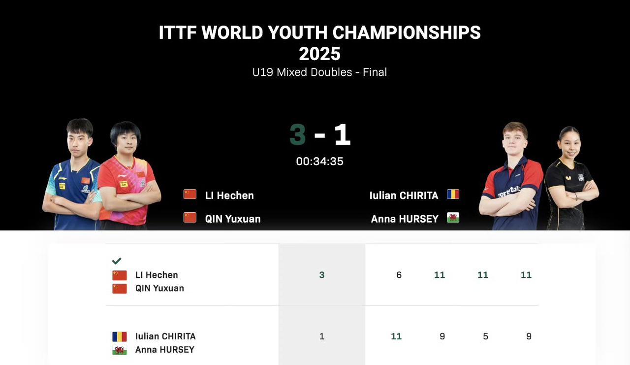 赛前绝没想到, 李和宸/覃予萱🇨🇳夺冠! 今日凌晨两点多,2025世青赛U19混双决赛落下帷幕, 国乒小将组合李和宸/覃予萱🇨🇳在先丢一局的不利局势下,3-1逆转战胜跨国组合奇里塔🇷🇴/赫西🏴󠁧󠁢󠁷󠁬󠁳󠁿,斩获冠军,四局比分为:6-11,11-9,11-5,11-9。 获得亚军的跨国组合就是在1/16决赛中,击败国乒温瑞博/纵歌曼🇨🇳的很有实力的组合。 李和宸的反手拧怎么拧怎么有,把握关键分的心态也是很坚决的,第四局他们7-1领先的,被追到9-9,但李和宸关键分心还把握住了。 李和宸/覃予萱🇨🇳继续努力!