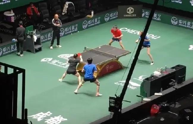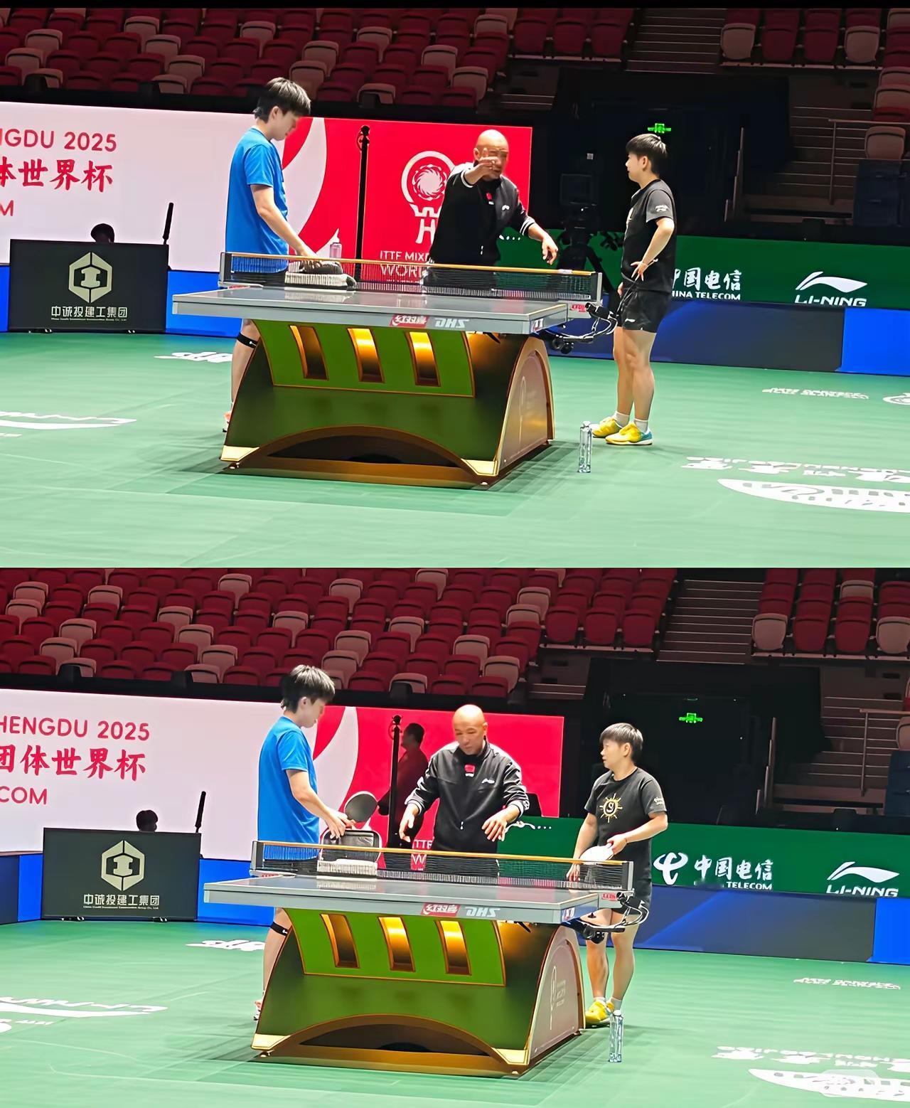 昨晚曼昱没有带二个亿妹妹偷溜出去尝美食了。 曼昱和队友一起在训练场上挥汗如雨练习双打,积极备战混团世界杯比赛,曼昱和蒯曼女双练习对手是男双林诗栋、梁靖昆。 曼昱练习球台的旁边是莎莎和王楚钦,莎头再度合体练混双,陈熠和袁励岑积极配合莎莎和王楚钦练球。 从28日晚上看,混合团体赛的男女混双,男双女双的组合,可谓是阵容强强联合,不出意外国乒拿下世界杯冠军十拿九稳。 期待他们场上发挥出色,期待观看他们精彩的表演。