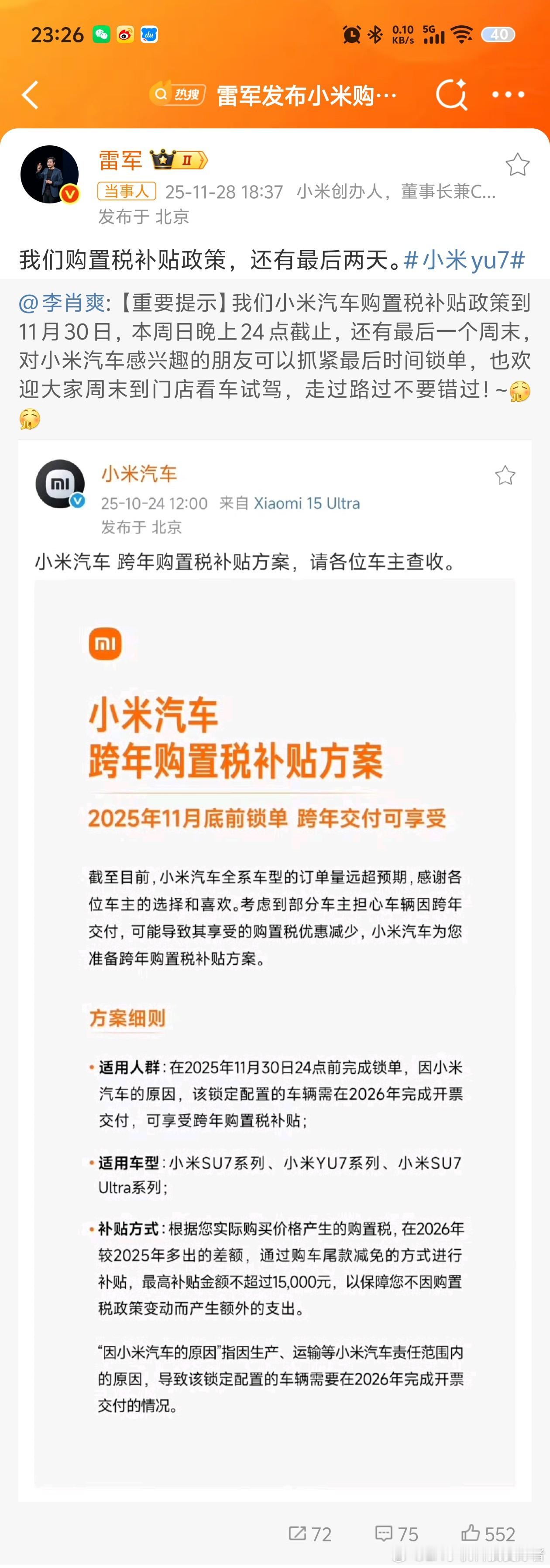 雷军发布小米购置税补贴重要提示小米汽车跨年购置税补贴方案到11月底就结束了,这两天锁单的明年交付可以享受小米兜底。想省钱的得抓紧了。