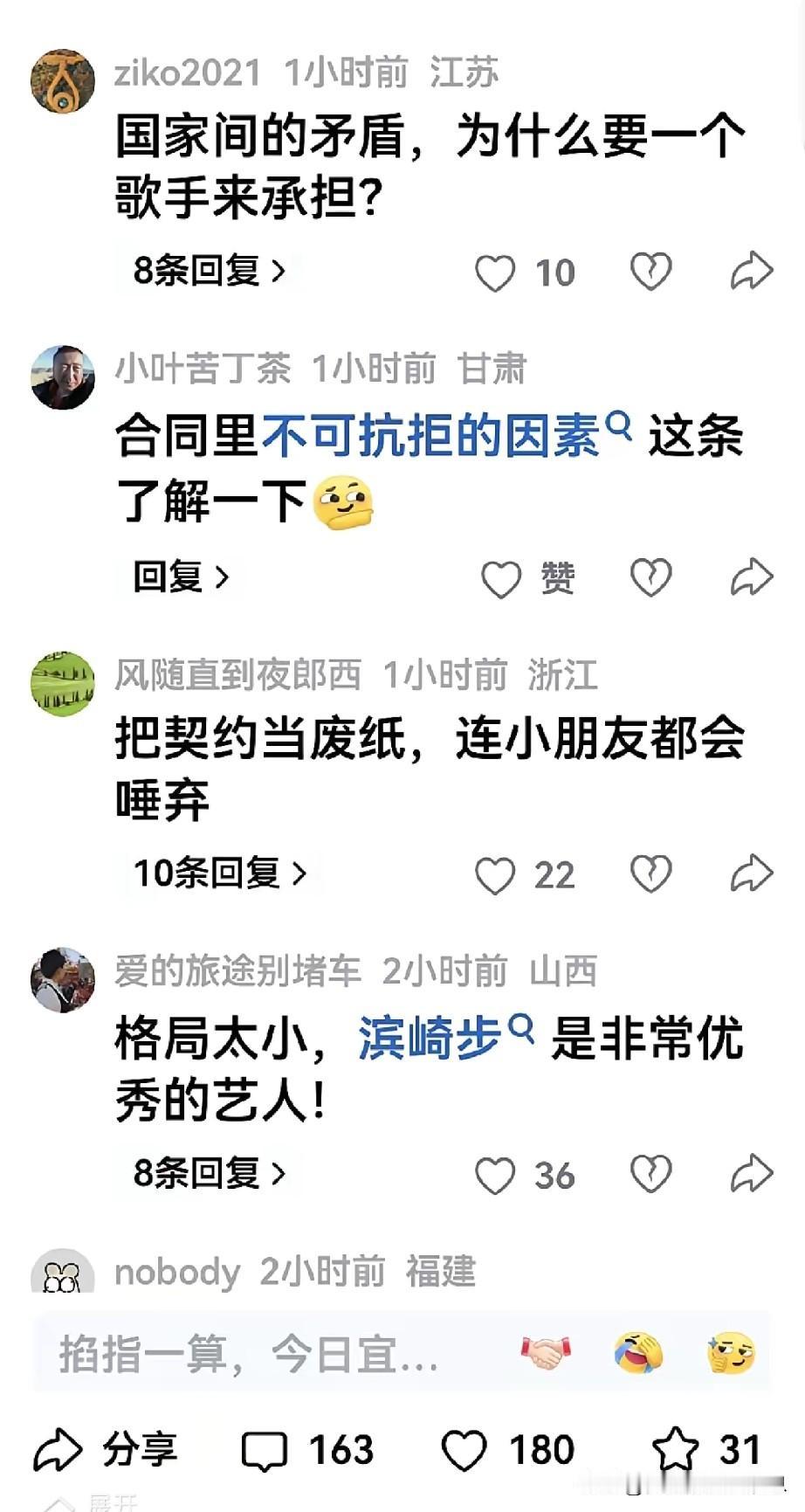 滨崎步的上海演唱会因为国家关系被取消,滨崎步也发文表示自己很难过。 网友支持国家做法的声音占大多数,也有少部分声音说不应该让国家关系影响艺人。说这话的人或许没想过,没国哪来家?还有人说双标,为什么不让美国的国家关系影响偶像和饭圈。但是大部分人还是理智的,国家利益高于一切,艺人不能损害国家利益。