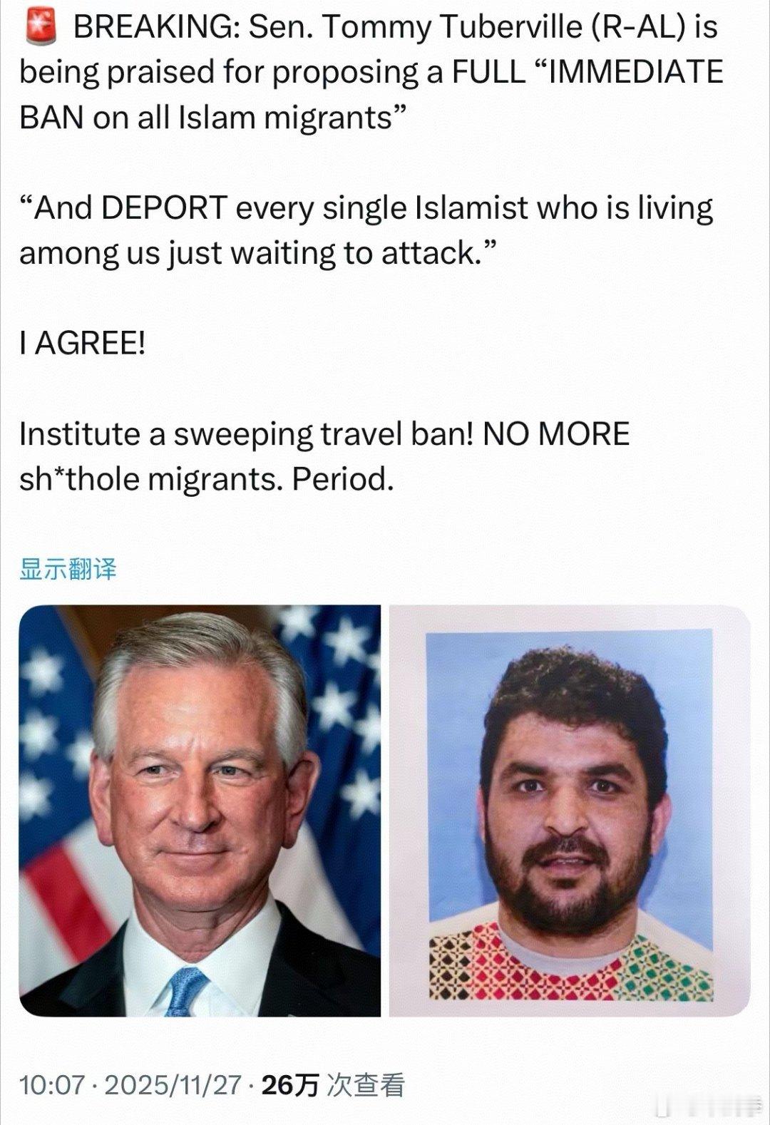 美国阿拉巴马州共和党参议员汤米·图伯维尔因提议“立即全面禁止所有伊斯兰移民”而受到赞扬。 “把所有生活在我们中间、伺机发动袭击的伊斯兰极端分子全部驱逐出境。”