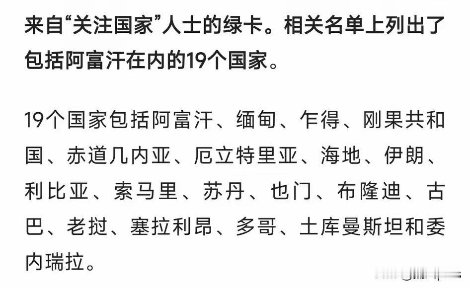 特朗普“严选”19个国家,将对这19个国家的绿卡持有者严格审查。这19个国家基本上是全球人均GDP倒数,发展程度不高,旅行存在一定风险,且伴随着冲突。 这里说的是大多数,也有一些例外。例如赤道几内亚人均GDP还挺高,刚果金没上榜,可能是特朗普搞错了。但总体上来说,特朗普点出的这19个国家多数是穷国。因此特朗普设置了更严格的门槛。