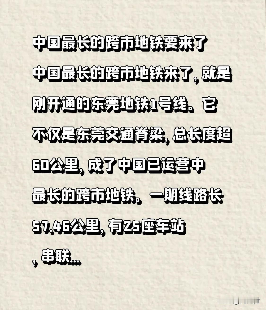 中国最长的跨市地铁要来了 中国最长的跨市地铁来了 就是刚开通的东莞地铁1号线 它是东莞交通脊梁 总长度超60公里 成了中国已运营中最长的跨市地铁 一期线路长57.46公里 有25座车站 串联水乡新城、中心城区等 途经10个镇街 它完善了市内交通 市民中心站能换乘2号线到虎门高铁站 跨城通勤也超便利 东莞西站能换乘城际 60分钟到广州白云机场 30分钟到深圳宝安机场 东城南站未来直通广州黄埔新港、衔接深圳地铁6号线 有了它 珠江口东岸城市格局和生活形态都要变啦! 东莞地铁1号线 东莞地铁线 东莞轨道规划 东莞企石3号线 1号线大朗站 东莞地铁打卡 东莞企石2号线