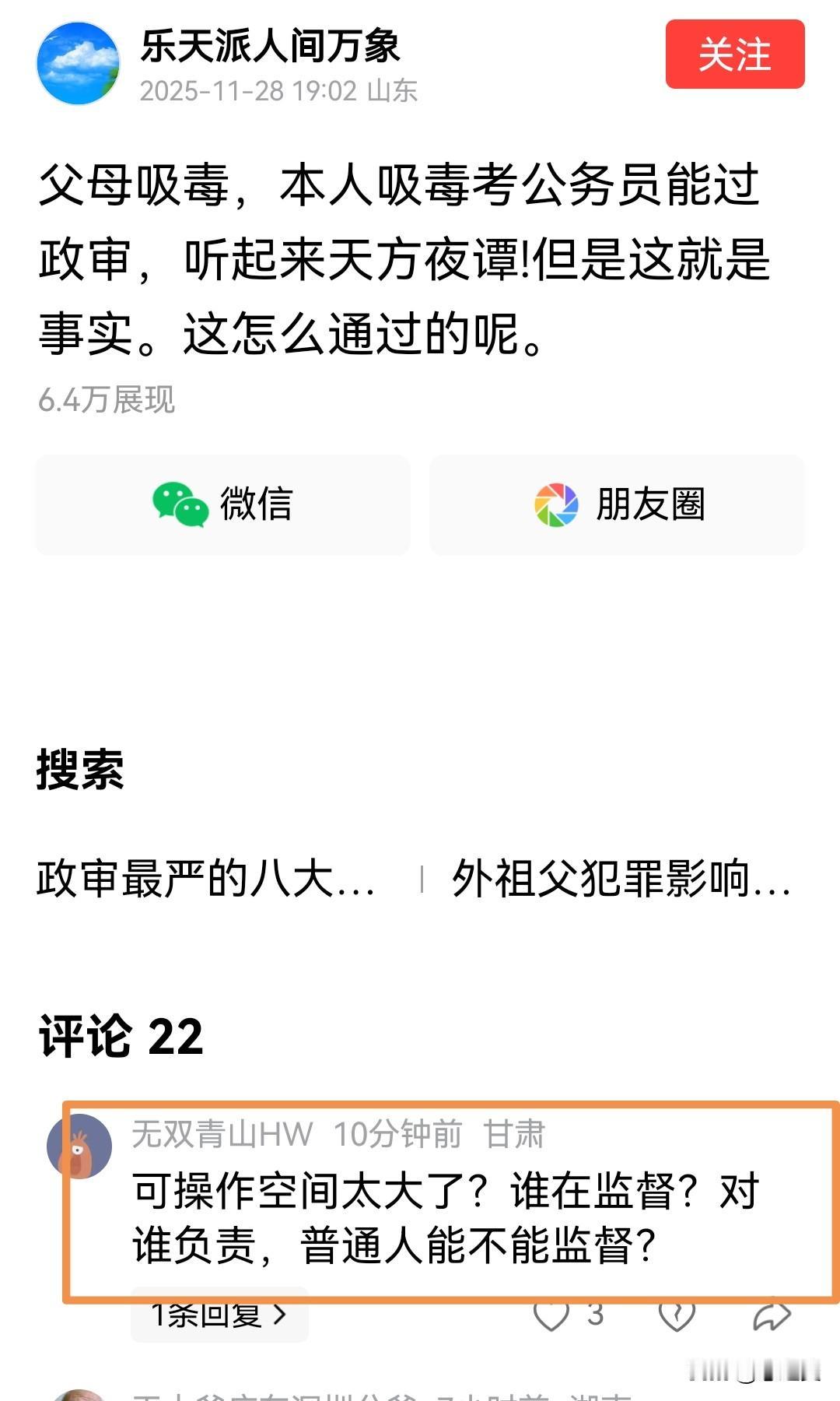 政审缺乏一个统一的规范。可操作空间很大。现有的参考文献最后都会说一句,具体情形各地情况不一样,请打电话向某某方求证。考公参军这么大的事,最终取决于一个电话。这里边的想象空间?是否真的有可操作的地方呢? 所以国家应该出台统一的政策规范,什么情况可以什么情况不可以,出台规范也能消灭现在网上吵翻天的公平争论。 曾经在酒桌上有这样一个段子,一个特别优秀的小伙子想要参军,但他老子不愿意。别人劝他老子当心小伙子自己报名,那时就晚了。他老子说,放心。我年轻时打架判过刑,政审他就过不了。 大家认为现在政审公平,公开统一吗?