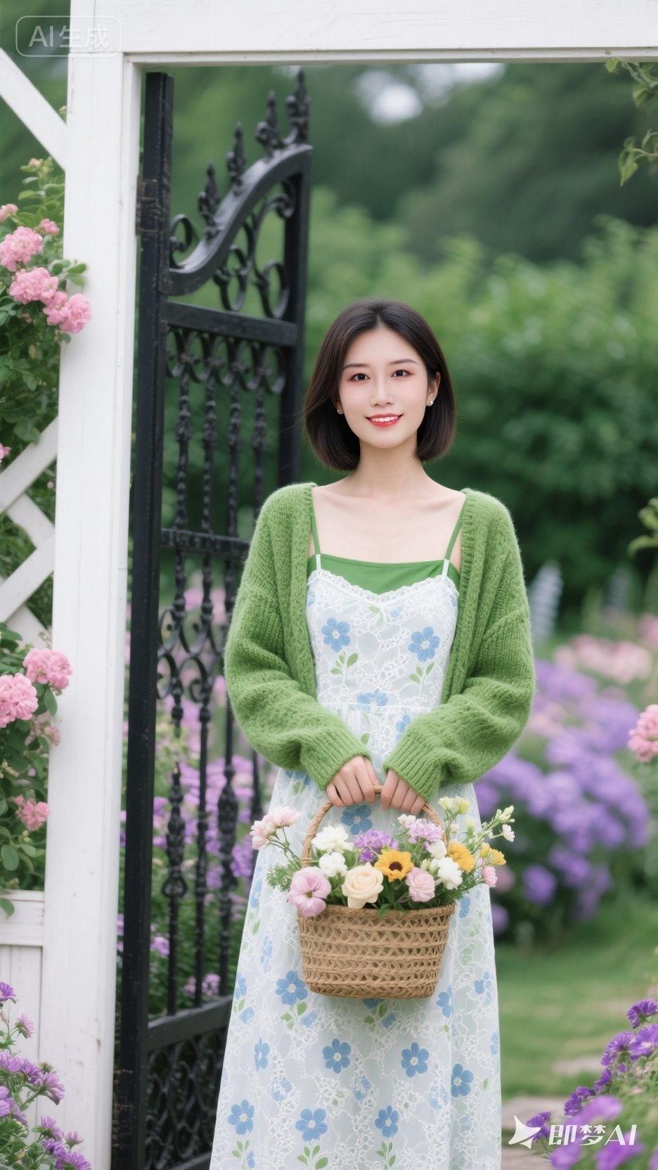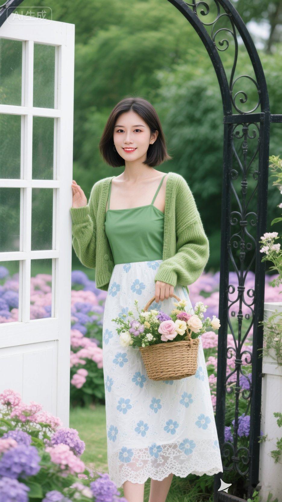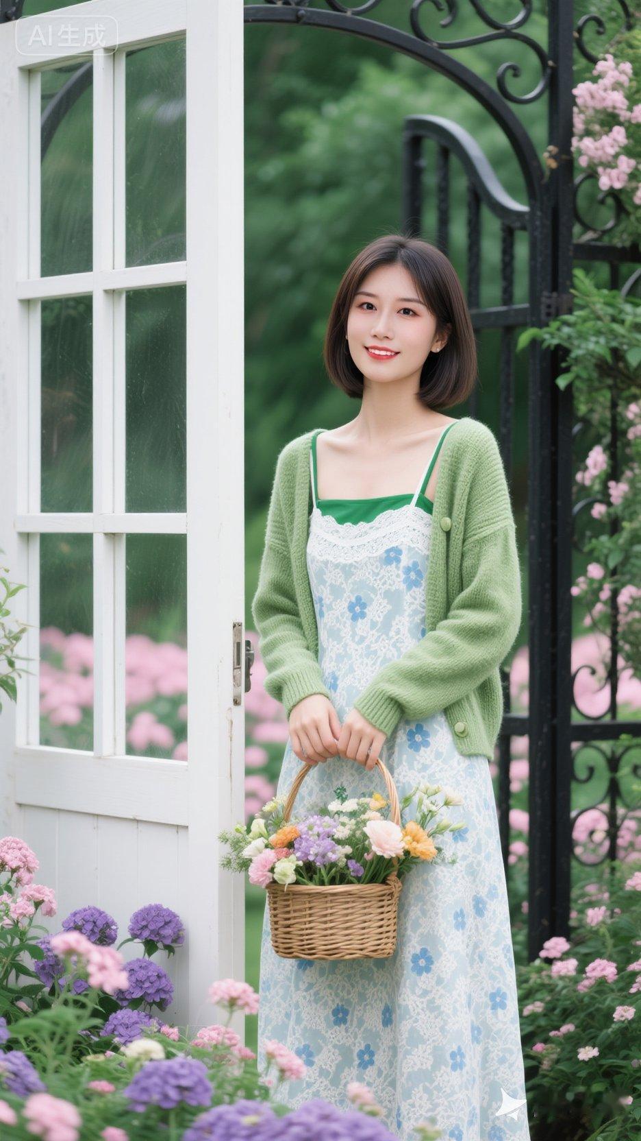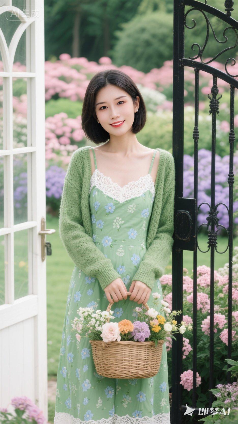 齐肩顺滑短发,冷白皮,妆容自然,身着带有白色、淡蓝色蕾丝花朵图案的绿色吊带长裙,外搭同色系针织开衫,手持编织篮,篮内装有各色鲜花。她站在带有黑色铁艺装饰的白色门框处,周围是种满粉色、紫色花卉的花园,整体呈现出清新自然的森系风格,配色以绿色为主,搭配花朵的白、蓝、粉、紫等色彩