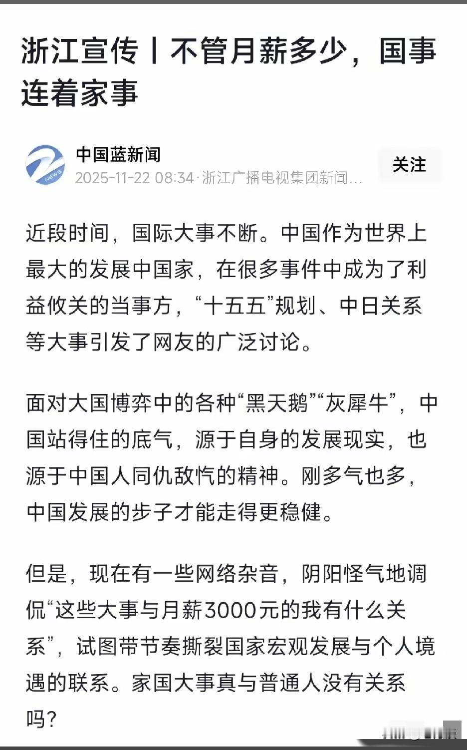 不管月薪多少,国事连着家事! 确实如此,也许暂时跟自己无关,但是国事的发展迟早会影响家事,不要抱着无所谓,跟我无关的心态,国事迟早会影响家事的,每个人都不可能脱离国家而单独存在。所以我们应该关心股市,为国事积极献言献策,发挥我们微小的力量,这样才能积少成多,为国家的发展提供智慧,提供建议。